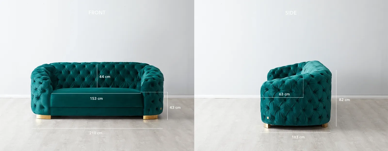 The Kelly Emerald Velvet 2-Seater Sofa offers an Art Deco twist on the classic Chesterfield design. It highlights its elegance with its tufted sections, draped in velvet fabric in a luxe Emerald shade.