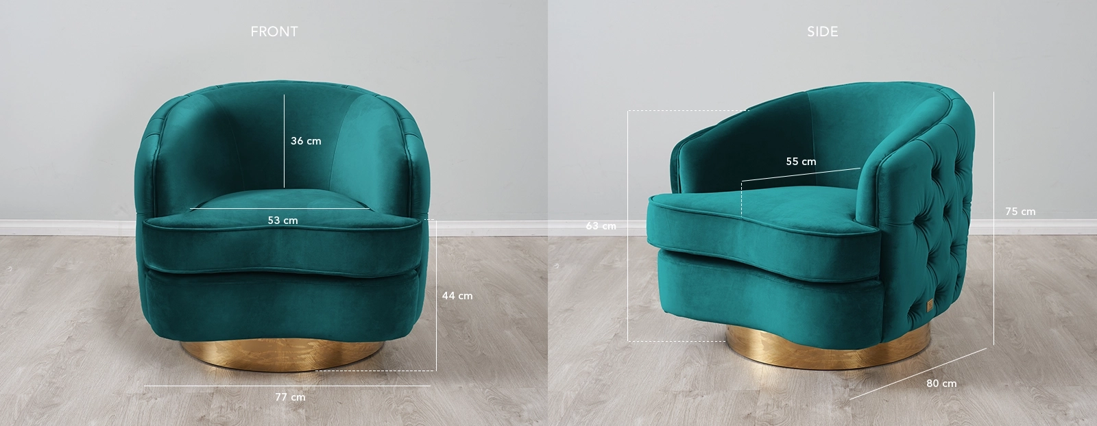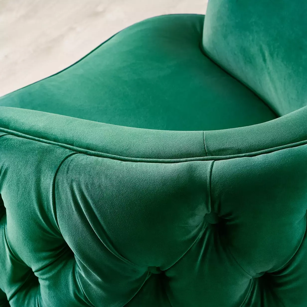 The Kelly Swivel Chair combines style with comfort, featuring a emerald velvet fabric on a well-crafted wooden frame. Hand-done button tufting adds to its plush appearance.