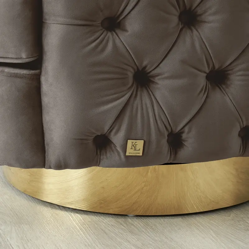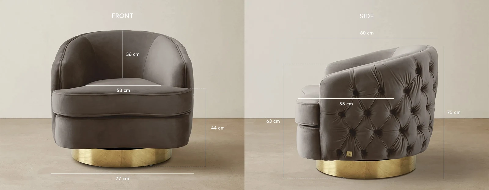 Layers of high-density foam ensure long-lasting comfort, while the golden-coloured legs add a touch of elegance. Available in various colours, the Kelly Swivel Chair offers versatile options to complement any décor.