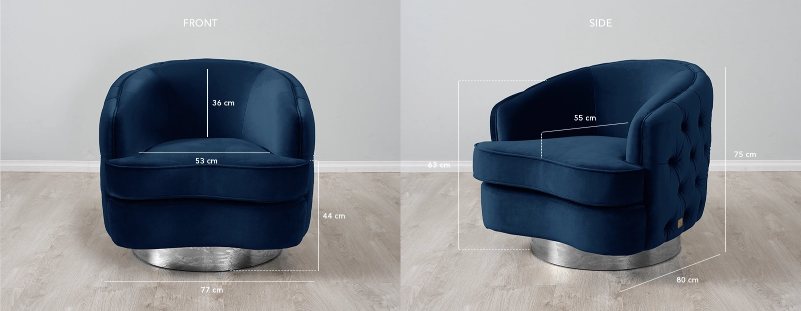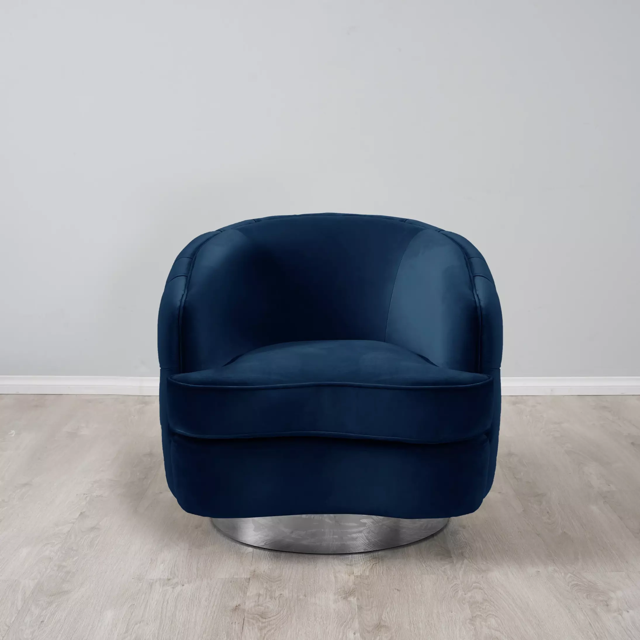 The Kelly Swivel Chair blends Art Deco style with comfort, featuring navy blue velvet upholstery on a meticulously crafted wooden frame. Its hand-done button tufting enhances the plush, luxurious appearance.