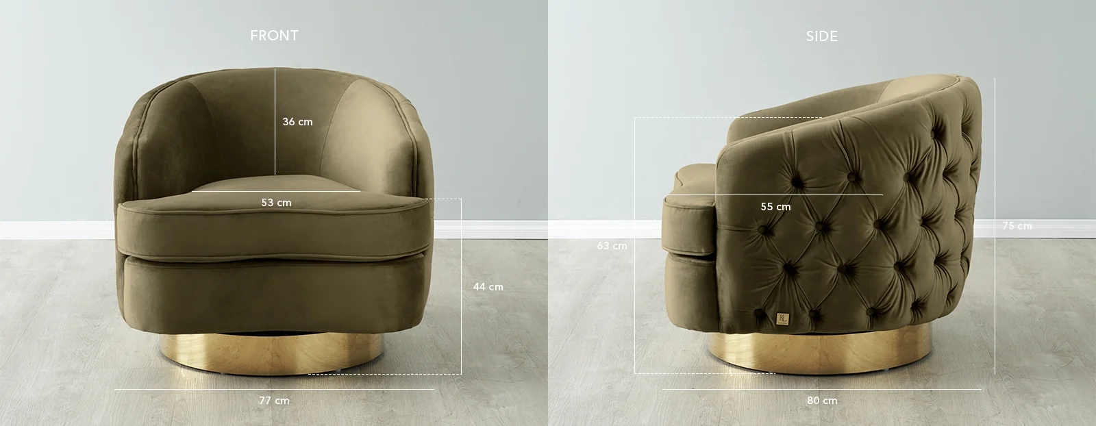 Layers of high-density foam ensure long-lasting comfort. The chair's golden coloured swivel base adds a touch of luxury. Available in various colors, the Kelly Swivel Chair offers options to match any decor.