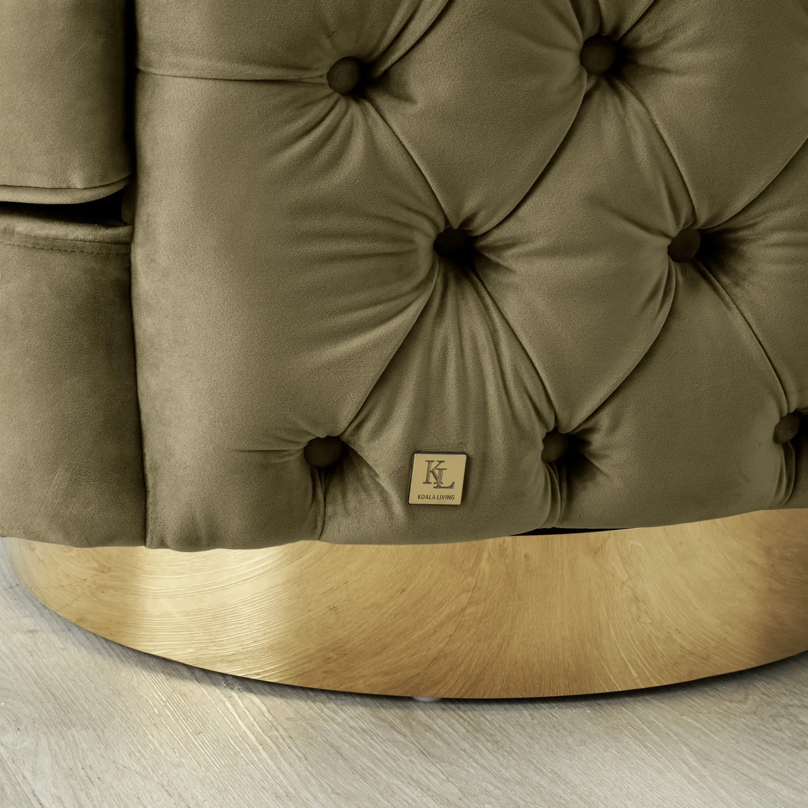 The Kelly Swivel Chair blends Art Deco style with comfort, featuring Olive Green velvet upholstery on a meticulously crafted wooden frame. Its hand-done button tufting enhances the plush, luxurious appearance.