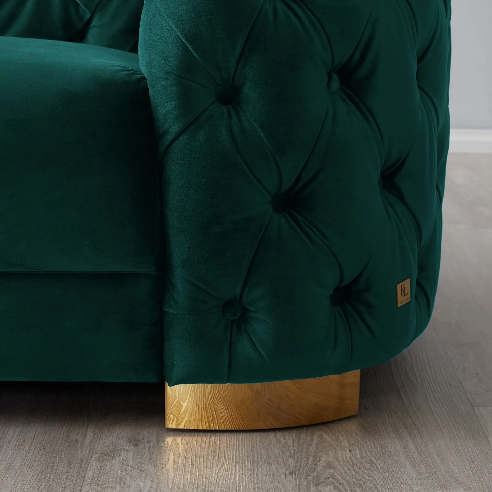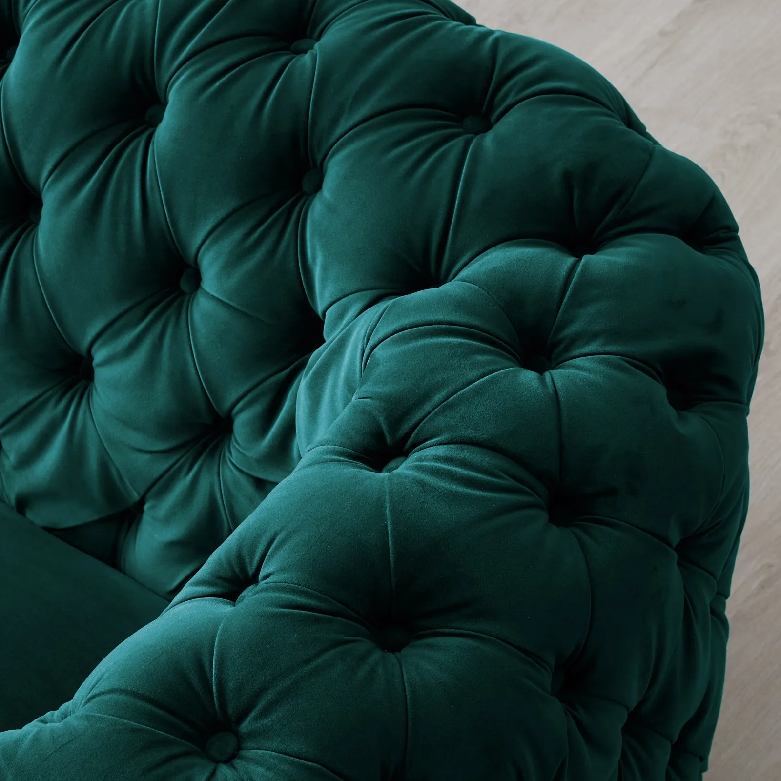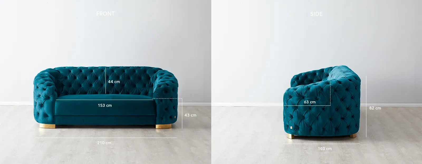 The Kelly Peacock Blue Velvet 2-Seater Sofa offers an Art Deco twist on the classic Chesterfield design. It highlights its elegance with its tufted sections, draped in velvet fabric in a luxe Peacock Blue shade.