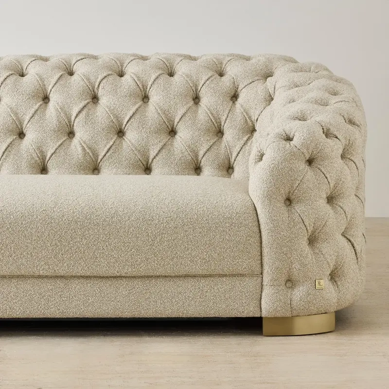 Wrapped in sumptuous Pearl Beige fabric, the sofa offers plush cushioning and a generous seat for unparalleled comfort. Resting on gleaming champagne gold legs, the Kelly exudes luxury and enduring style.