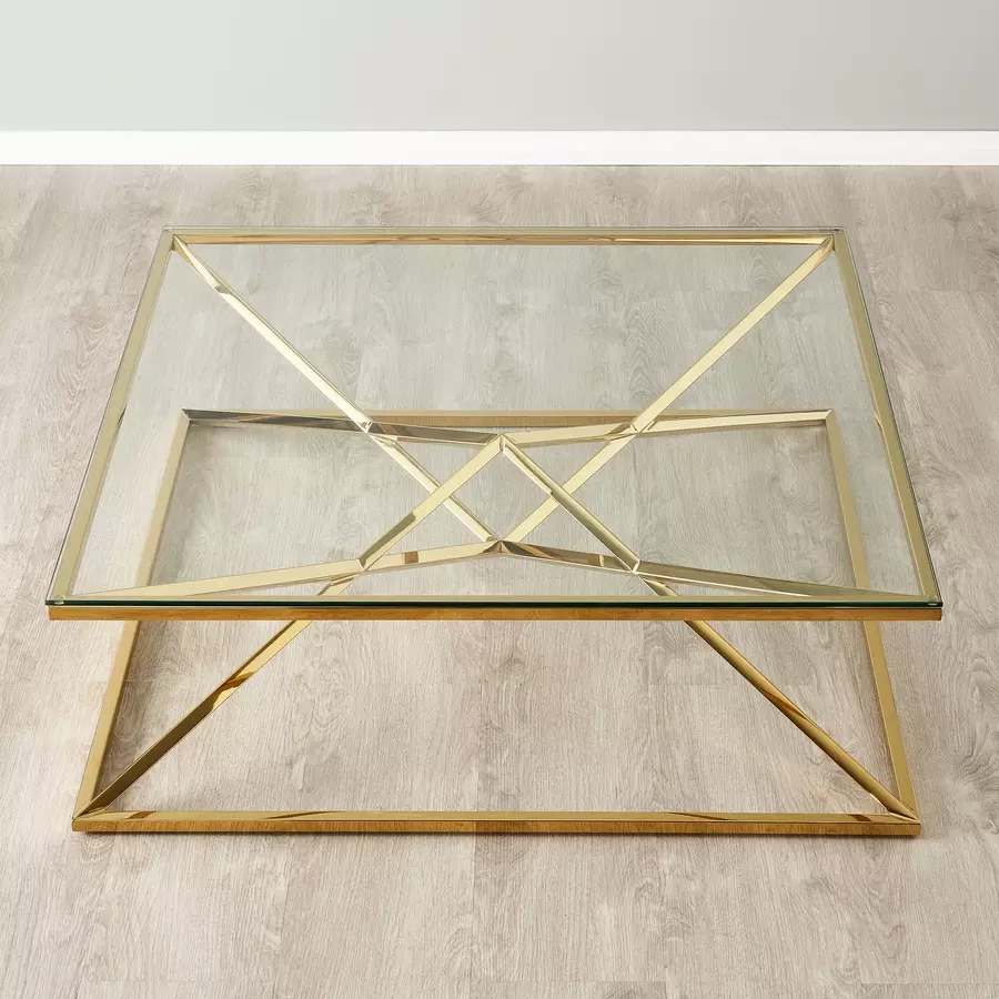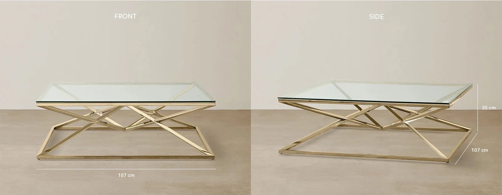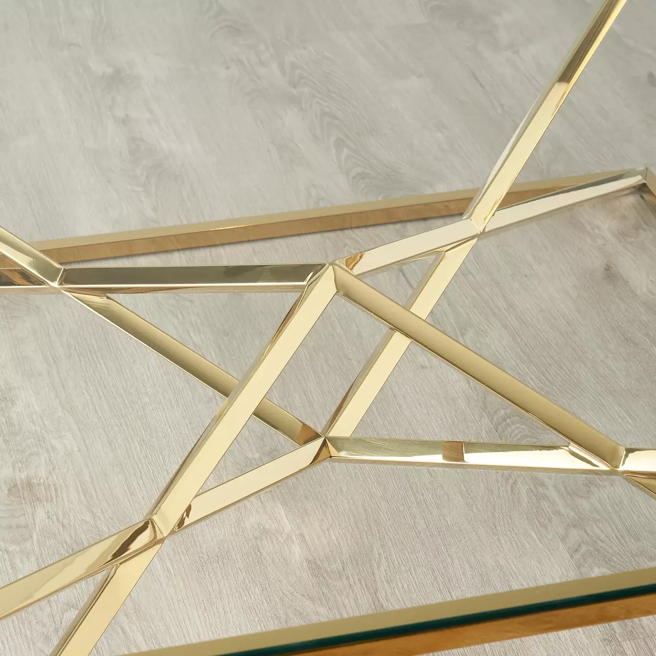 The Knox Coffee Table features a transparent glass top resting on a geometric champagne gold stainless steel base. Its design seamlessly combines form and function, providing a spacious area for everyday essentials while maintaining an open, uncluttered look.