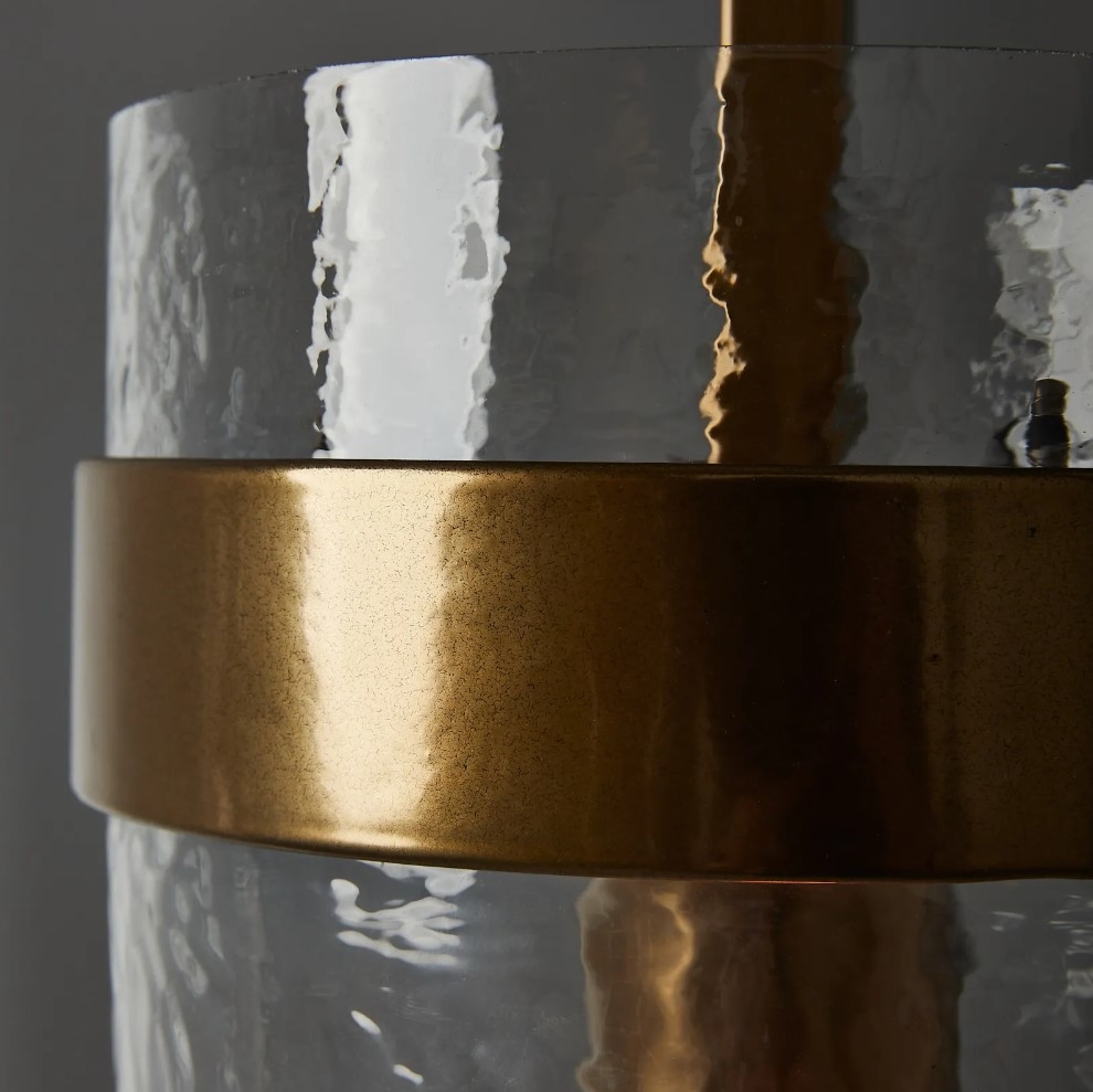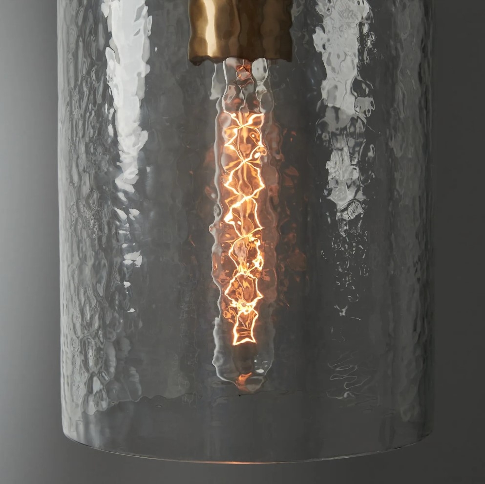 In the realm of contemporary lighting design, the Kristoff Clear Glass Satin Brass Atrium Pendant light stands as a testament to refined elegance. At its heart, an incandescent bulb radiates warmth, encapsulated by a meticulously hammered glass covering that dances with light and shadow.