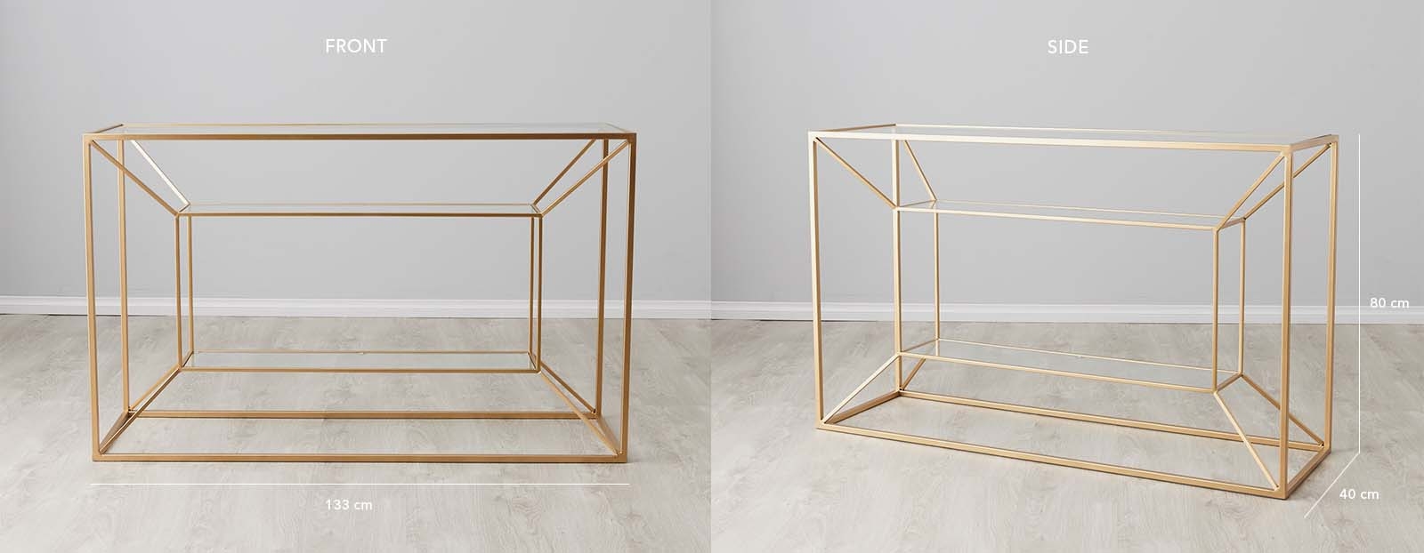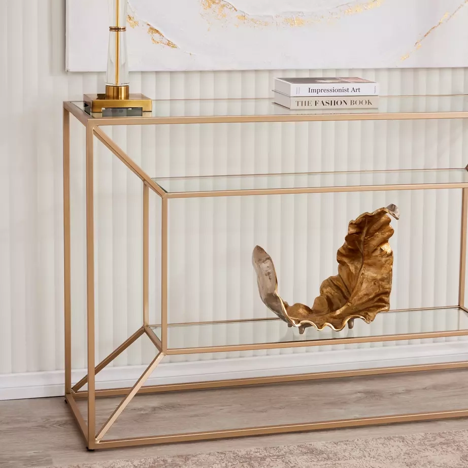 A distinct air of elegance permeates throughout our beautiful Golden Laila Glass Console Table. It aims to dazzle you with its artistically designed frame that's both a nod to classic looks and modern minimalism. The Laila Console Table presents a masterfully crafted geometric frame with an open design that allows light and the beauty of your other pieces to shine through. The Laila plays with light and space to add intrigue to your home.