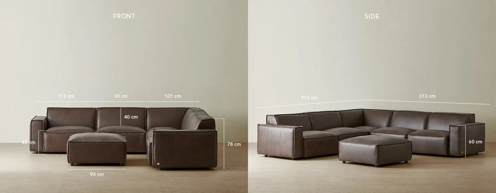 The Lainey is modular living, streamlined. Crafted with chocolate brown coloured leather, the Lainey brings clean lines and thoughtful flexibility to any space.