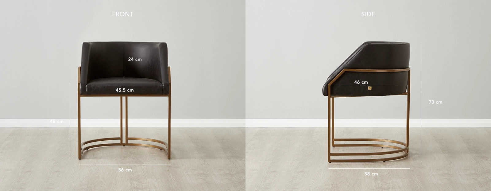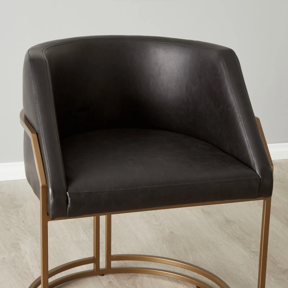 The Sleek Black hue of the leather enhances the chair's luxurious aesthetic, radiating sophistication. Sink into the plush seat and feel the embrace of the smooth and luxurious material. A sturdy metal frame in a brass-coloured finish envelops the seat, adding a touch of sophistication and visual interest. The slender design of the leg frame exudes a sense of lightness and grace, while the brass colour lends an element of timeless charm.