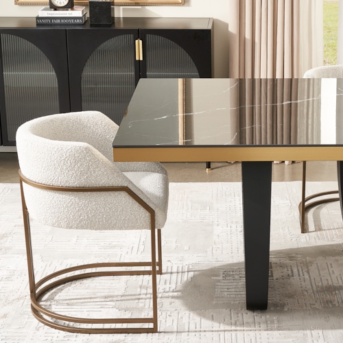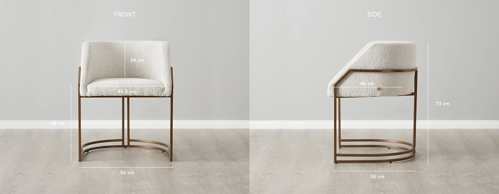 The Pristine Cream hues of the Boucle enhance the chair's luxurious aesthetic, radiating sophistication. Sink into the plush seat and feel the embrace of the soft and sumptuous material. A sturdy metal frame in a brass-coloured finish envelops the seat, adding a touch of sophistication and visual interest. The slender design of the leg frame exudes a sense of lightness and grace, while the brass colour lends an element of timeless charm.