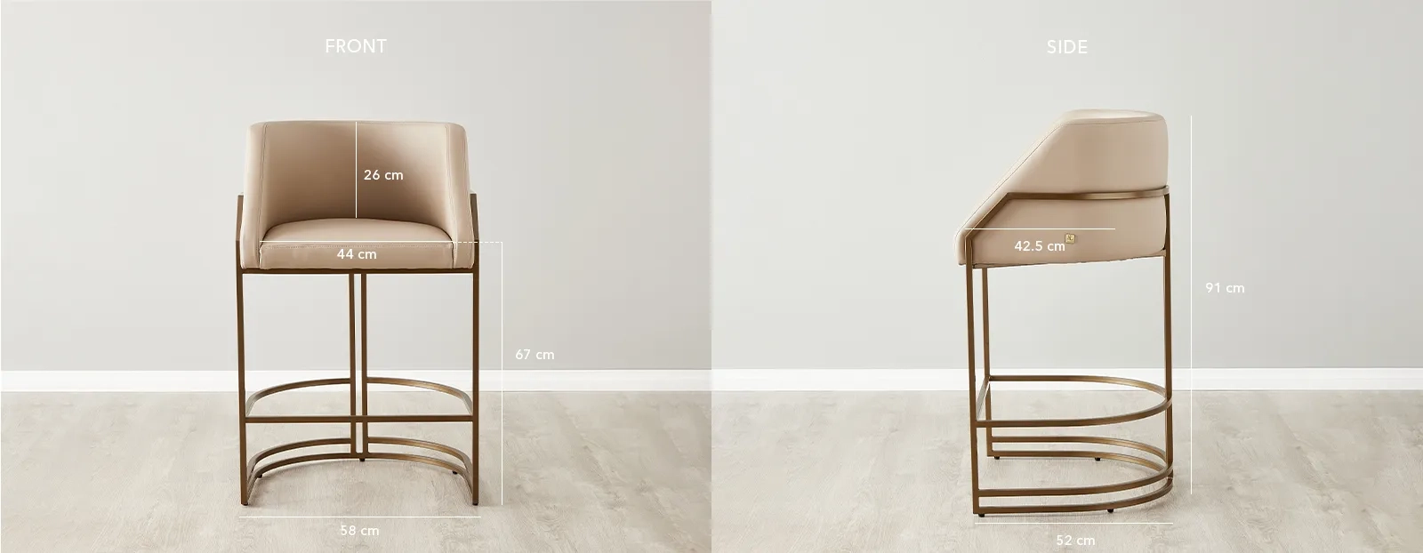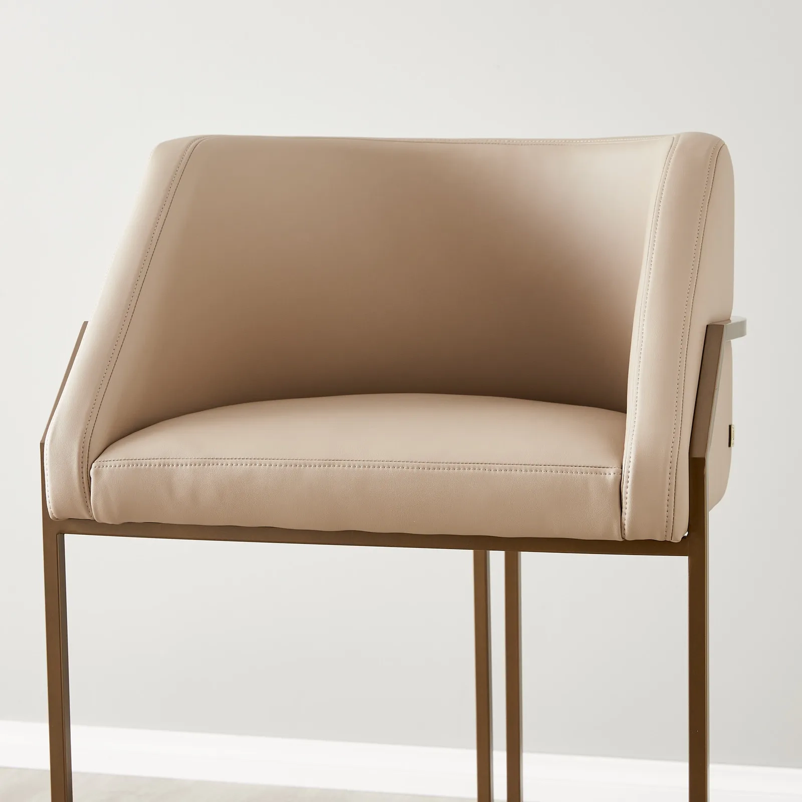 Upholstered in premium sand beige vegan leather, the stool radiates a sense of luxury and ethical appeal. The vegan leather's fine texture and warm hue contribute to the stool's sophisticated charm, making it a perfect match for any high-end kitchen or bar space. Encased within a durable metal frame with a brass finish, the design marries strength with finesse, ensuring stability without compromising on style.