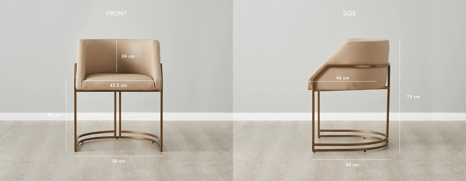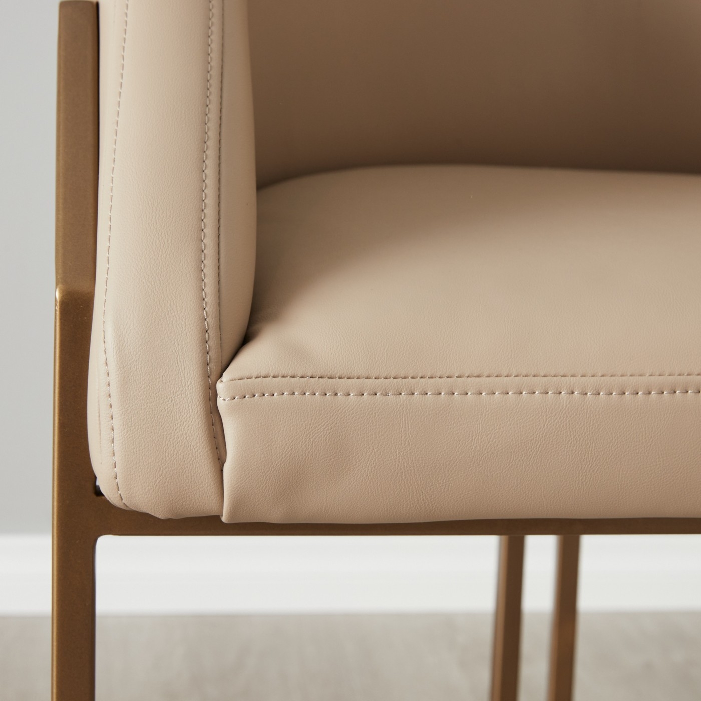 Upholstered in high-quality vegan leather, the Laura Chair exudes an air of opulence and refinement. The sand beige hue of the leather enhances the chair's luxurious aesthetic, radiating warmth and sophistication. Sink into the plush seat and feel the embrace of the smooth and luxurious material. A sturdy metal frame in a brass-coloured finish envelops the seat, adding a touch of sophistication and visual interest. The slender design of the leg frame exudes a sense of lightness and grace, while the brass colour lends an element of timeless charm.