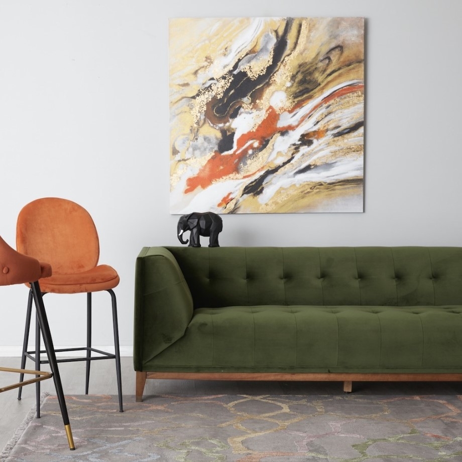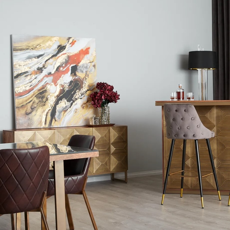 The interplay of burnt orange with shades of white, black, grey, and gold creates a balanced visual delight. It's more than just a painting; it's a burst of life, adding vibrance and a touch of spirited flair to any room it adorns.