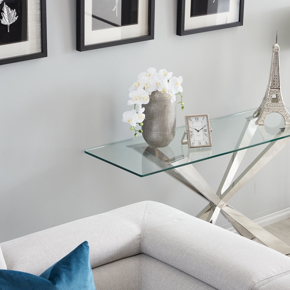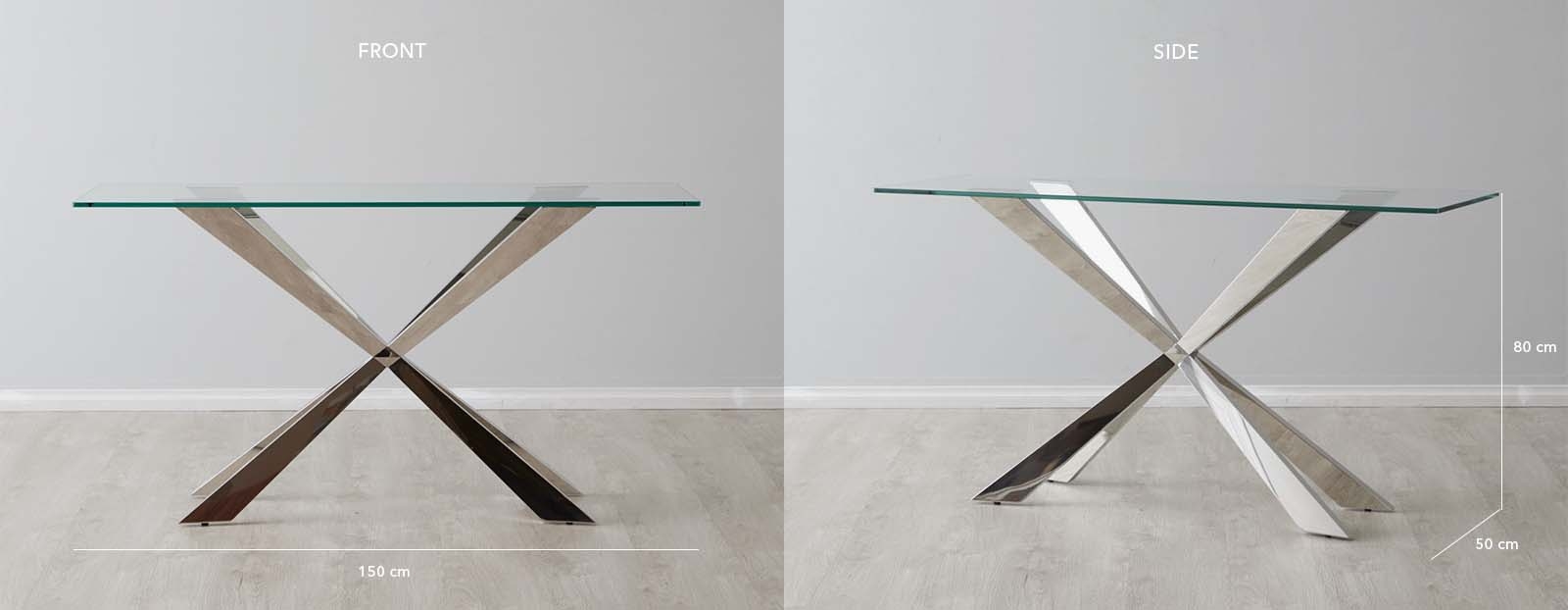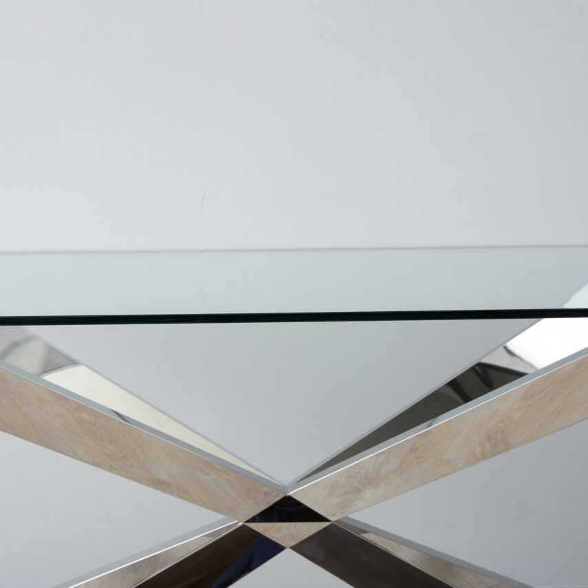 An elegant stainless steel frame in a stylish cross design supports the glass top with legs that shine in silver. The glass and stainless steel come together to create a modern aesthetic that makes the Lena Stainless Steel Console Table a must-have for any modern home.