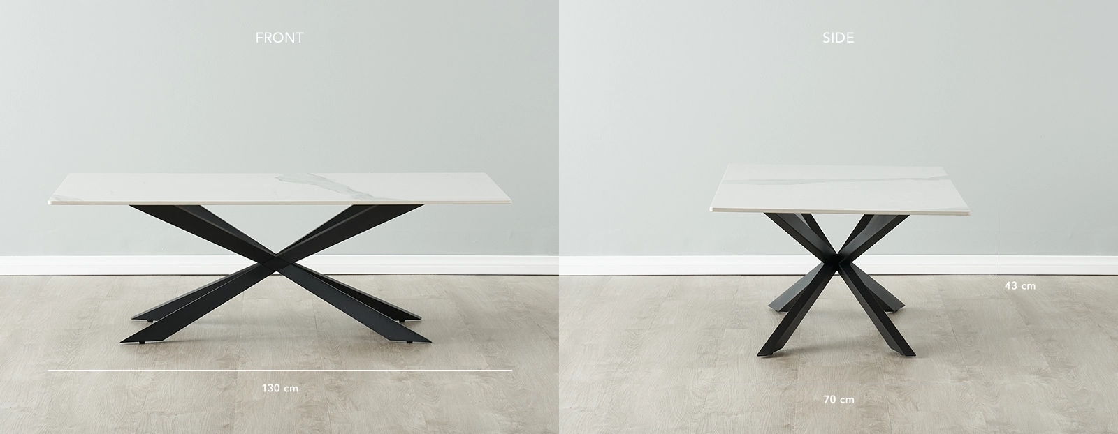 It features a spacious sintered stone tabletop supported by black stainless steel legs in a striking geometric design. Ideal for decor, books, or gatherings, it pairs well with sofas and a stylish rug for a cohesive living room look.