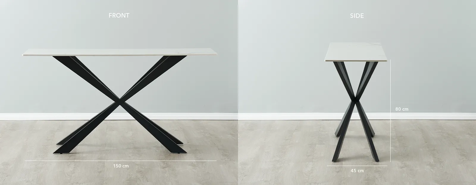 A cacophony of black-coloured stainless steel converges along the Lena's underside, revealing table legs in striking geometric form. The white sintered stone and dark iron come together to create a modern aesthetic that makes the Lena White Sintered Stone Console Table a must-have for any modern home. Best paired with one of our occasional chairs and a monochromatic floor rug.