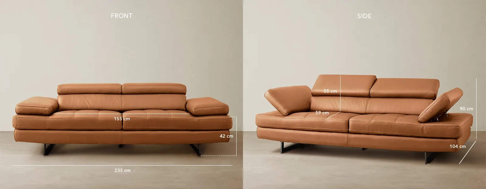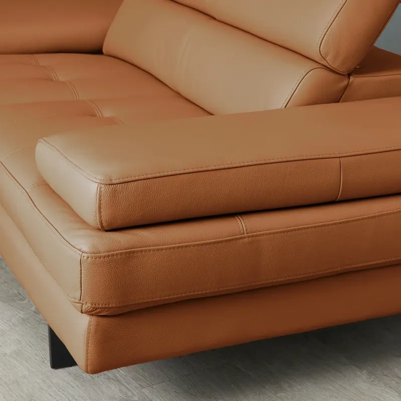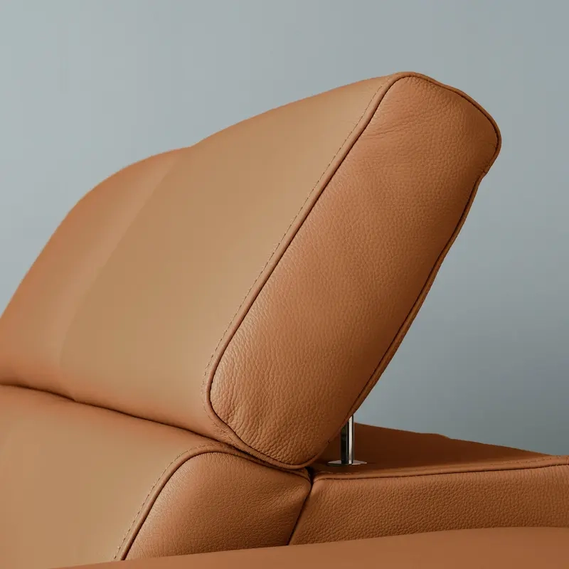 Equipped with adjustable headrests, the sofa ensures personalized comfort. The wide seats, filled with high-density foam, offer exceptional relaxation. Black legs add a sleek, contemporary finish.