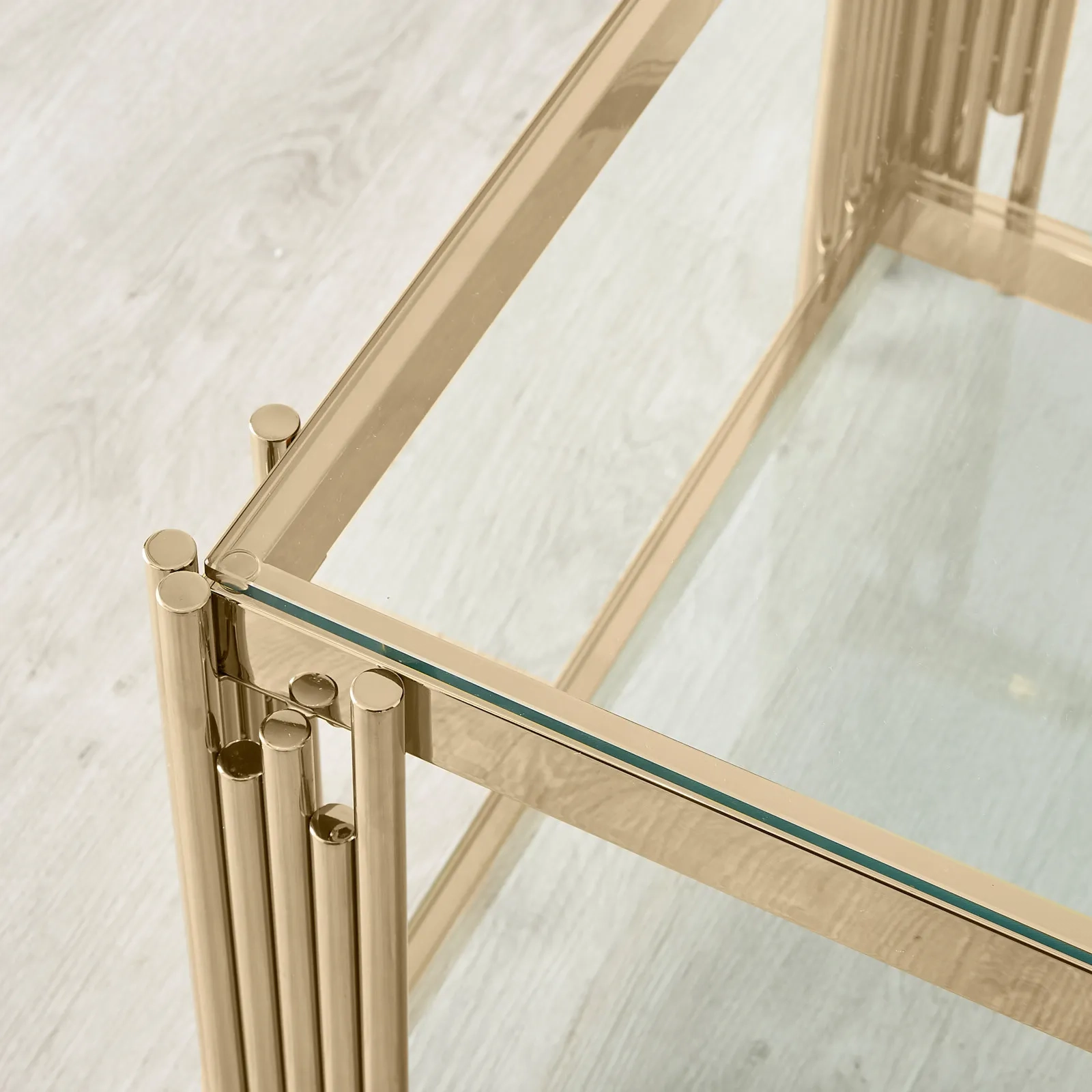 The Lindsay Coffee Table features stainless steel tubes at each corner, adding a unique and glamorous touch to your space. A lower section provides extra storage to keep your living room organized and clutter-free.