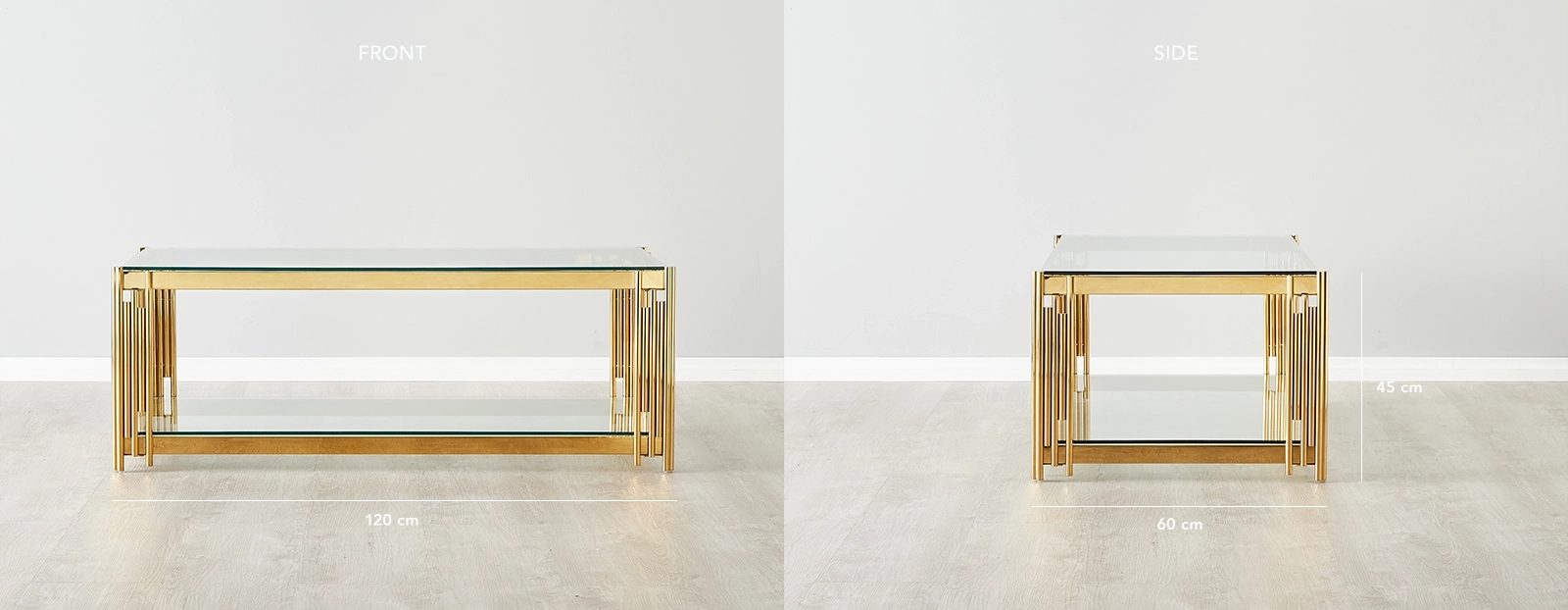Add golden lustre to your living area with the Lindsay Coffee Table, featuring a finely detailed stainless-steel frame. Its spacious tempered glass top offers ample space for decorations, books, and more.