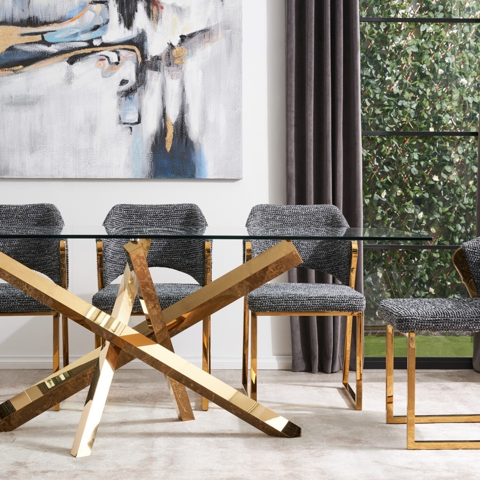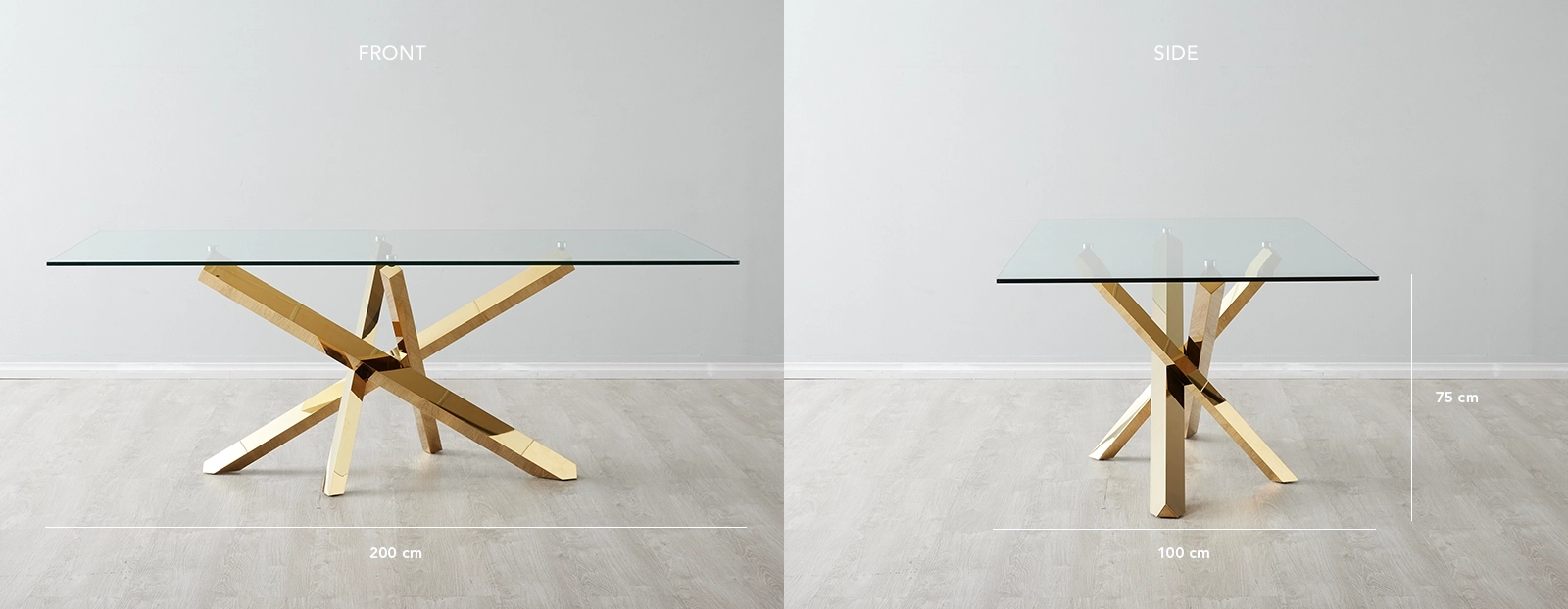 The lustrous gold stainless steel frames, strategically positioned with an asymmetrical touch, not only add a touch of elegance but also ensure stability, providing you with a worry-free dining experience. Its luxurious shine and exquisite craftsmanship will undoubtedly leave a lasting impression on your guests. For a complete and cohesive look, pair the Lola Dining Table with our carefully curated selection of Dining Chairs.