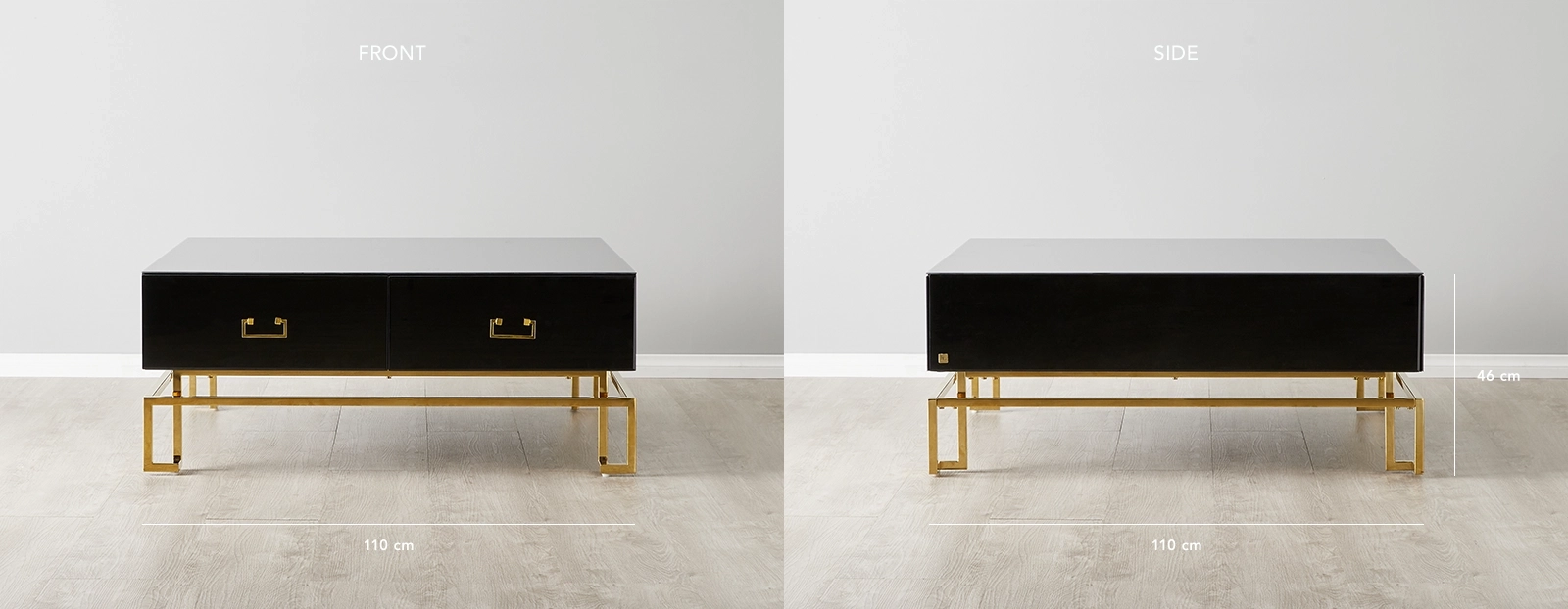 The Luella Black Coffee Table features drawer faces with reflective surfaces and elegant golden handles for a touch of glamour. Its Greek-inspired frame provides a sturdy foundation and artistic distinction, showcasing exquisite craftsmanship and modern design.