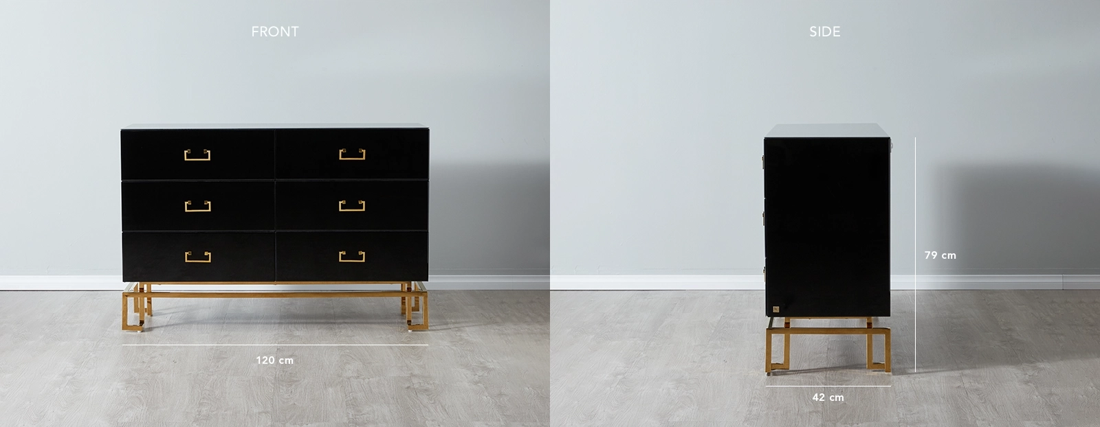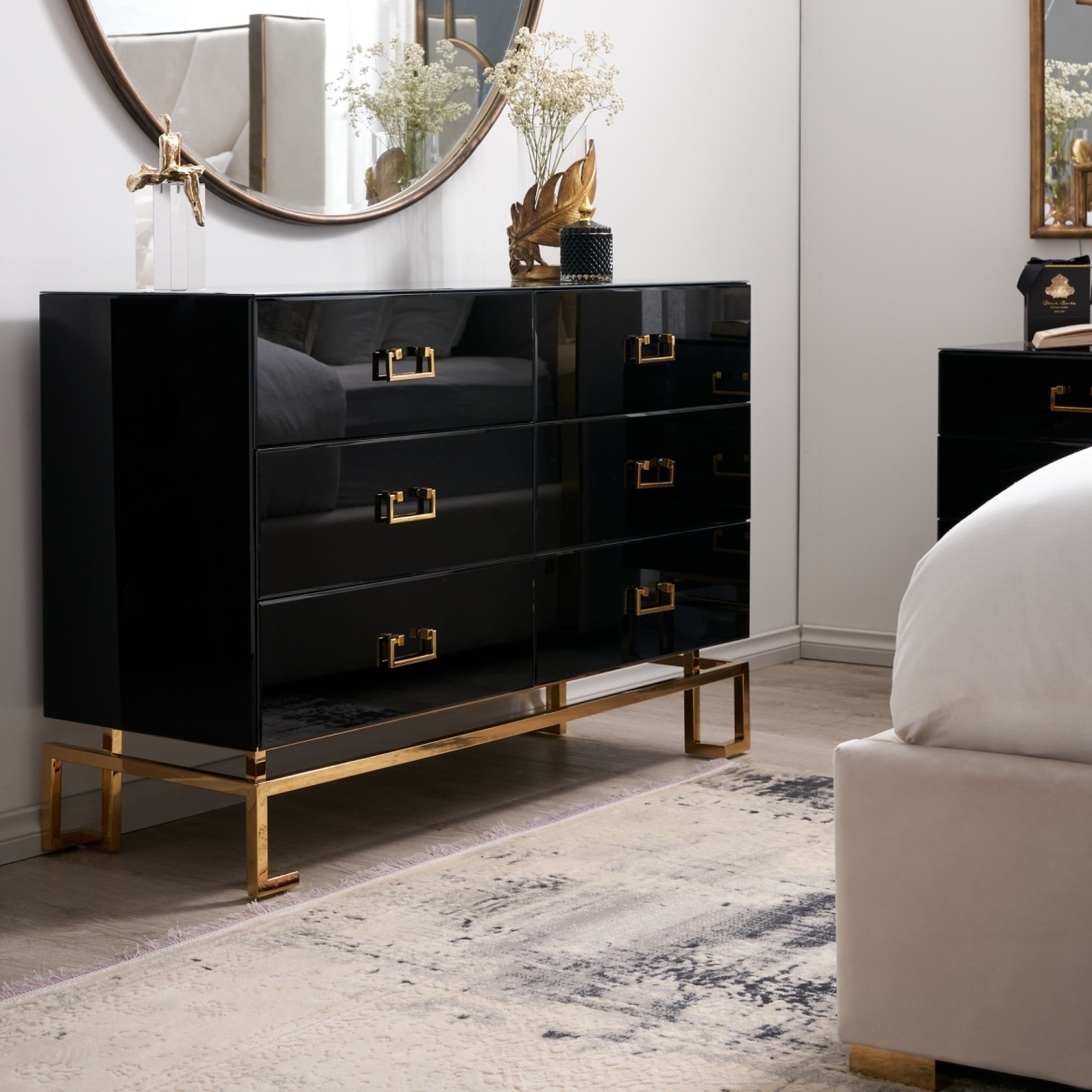 Crafted with a combination of premium quality wood and reflective surfaces, each drawer face exudes sophistication and elegance. The addition of golden handles adds a touch of glamour, elevating the overall aesthetic of the Dresser. Drawing inspiration from Greek lines, the frame of the Luella Black Dresser mesmerizingly provides ample support and stability. This unique feature adds an artistic touch and sets it apart from ordinary Dressers, making it a standout piece in your space.