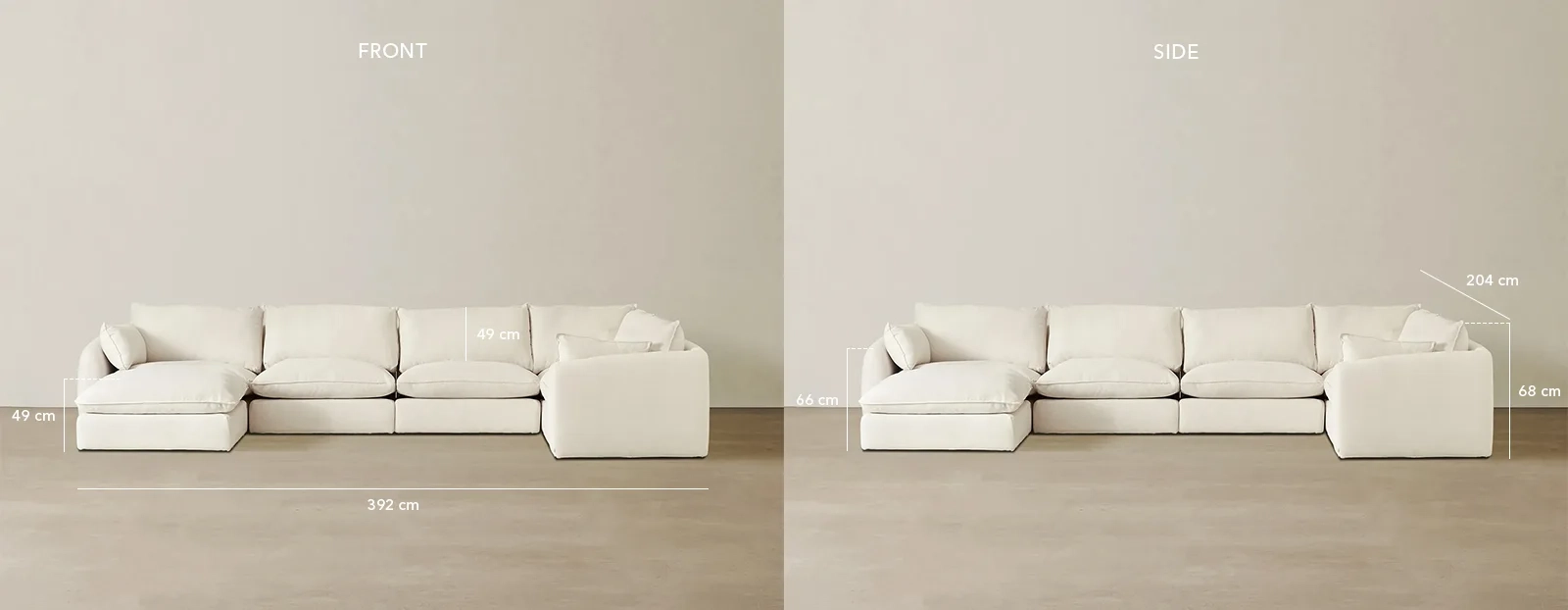The Macie Lite Chiffon White Fabric Modular Corner Sofa with Ottoman combines comfort and flexibility in a simple, low-profile design. Its deep seats and soft cushions create a relaxed feel suited for everyday lounging.