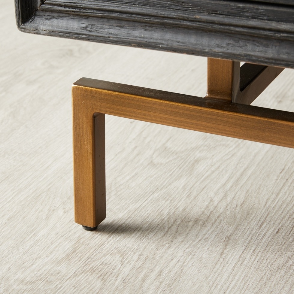 The Mackenzie Black Coffee Table is crafted from high-grade oak in an elegant white finish, supported by a sturdy iron and metal frame with an Art Deco design. Pair it with decor like vases or figurines to enhance its luxurious appeal.