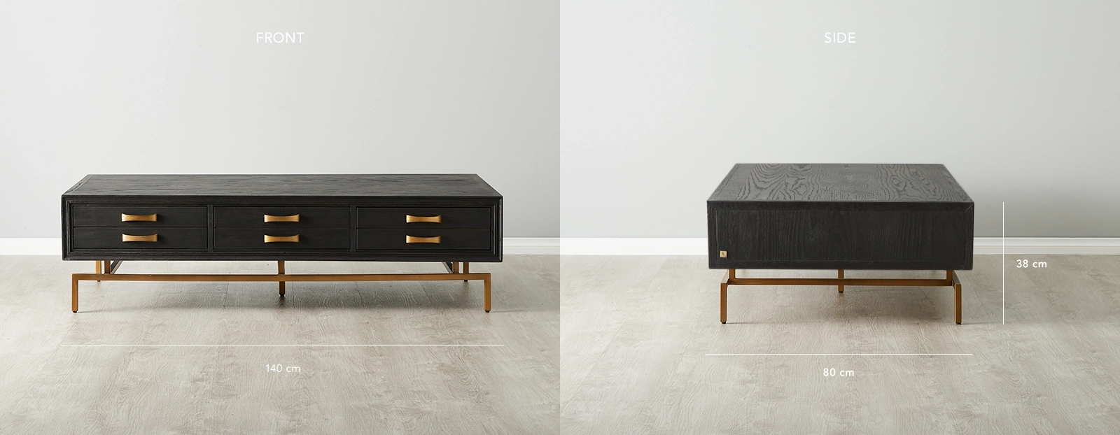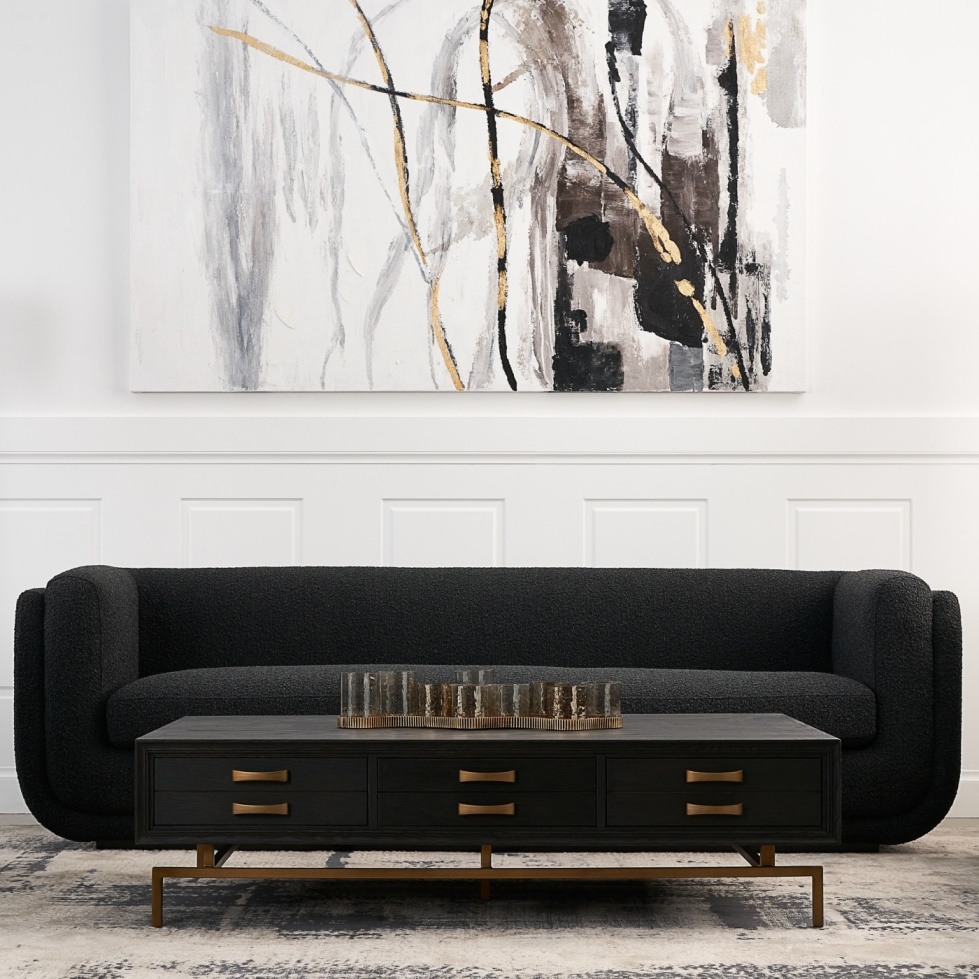 The Mackenzie Black Wooden Coffee Table combines Art Deco design with practicality, featuring a spacious tabletop for work or relaxation. Six pull-out drawers with brass-coloured handles provide ample storage for any living room.