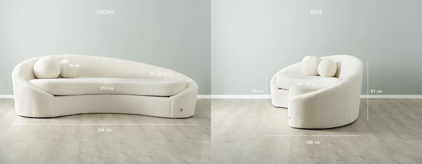 With its graceful, sweeping curves, the Maddie 3-Seater Sofa embodies sleek modern comfort. Draped in a heavenly hue of Cream Turrel fabric, it promises to envelop you in plush luxury.