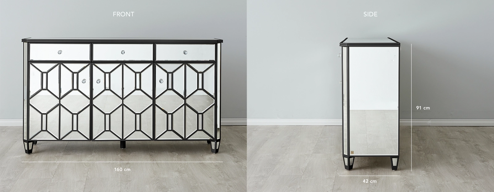 The Madeleine Sideboard is a mesmerizing piece that immediately captures the imagination. It is made with high-quality materials expertly crafted to create a functional work of art. A beautiful array of elegantly designed mirrors decorate the top, sides and front of the piece. These gorgeous panels are fashioned in an awe-inspiring geometric pattern reminiscent of vintage art-deco style.