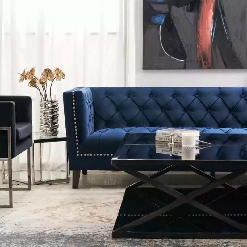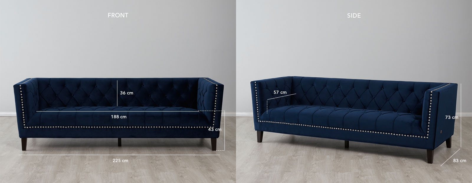 The Manuel 3-Seater Sofa offers a fresh and luxurious take on the classic Tuxedo design. Its adeptly crafted wooden frame is draped in velvet fabric, coloured in an elegant navy-blue shade.