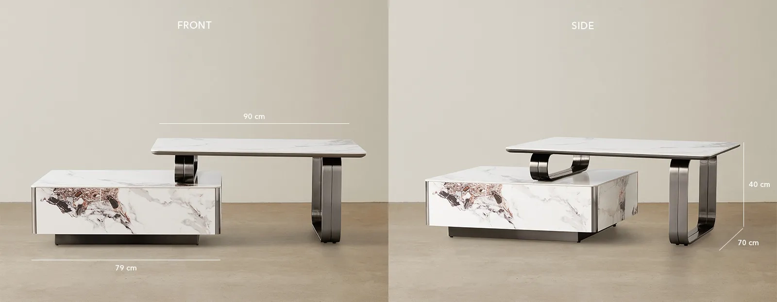 The Marbella 2-Layered Cold Calacatta White Sintered Stone Coffee Table combines ultra-modern design with practical elegance. Its radiant Calacatta sintered stone top, with unique veining, is paired with a striking black nickel frame, creating a captivating centrepiece.