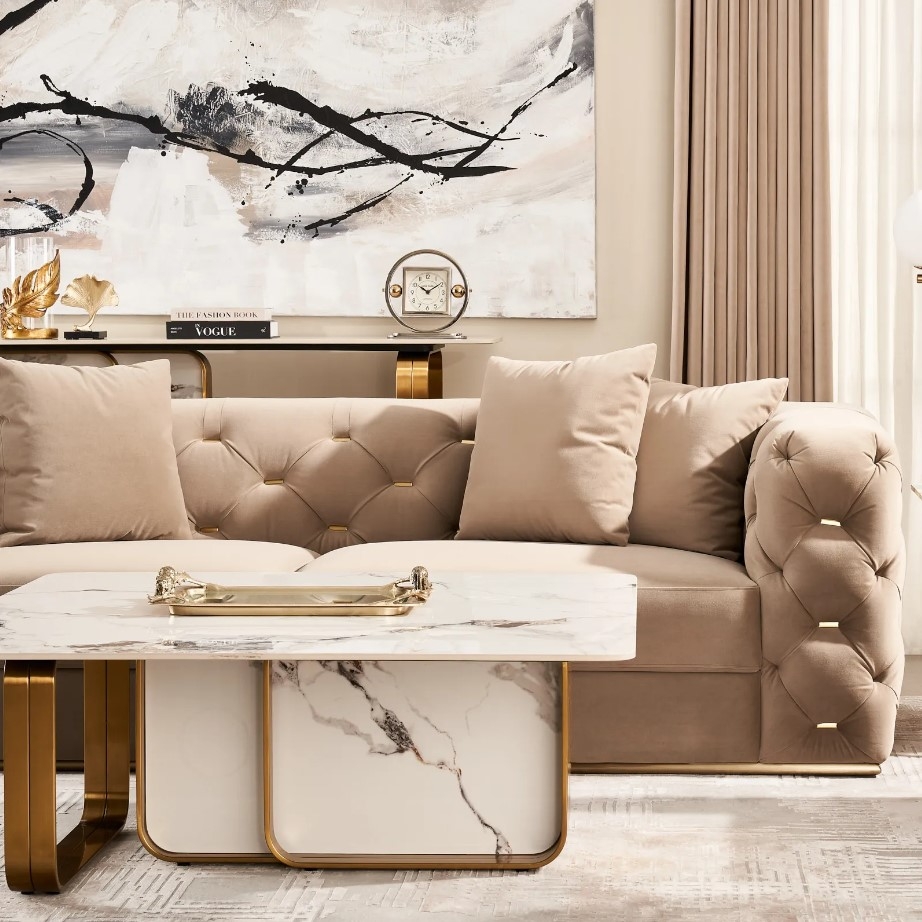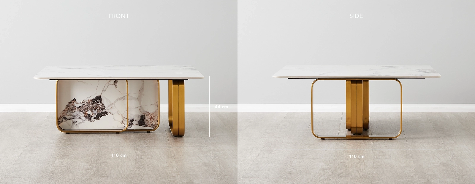 The Marbella Cold Calacatta White Sintered Stone Coffee Table combines functionality with luxurious design, featuring an expansive stone top with elegant veining. Perfect for decor, magazines, or everyday use, it adds sophistication and ample space to any living area.