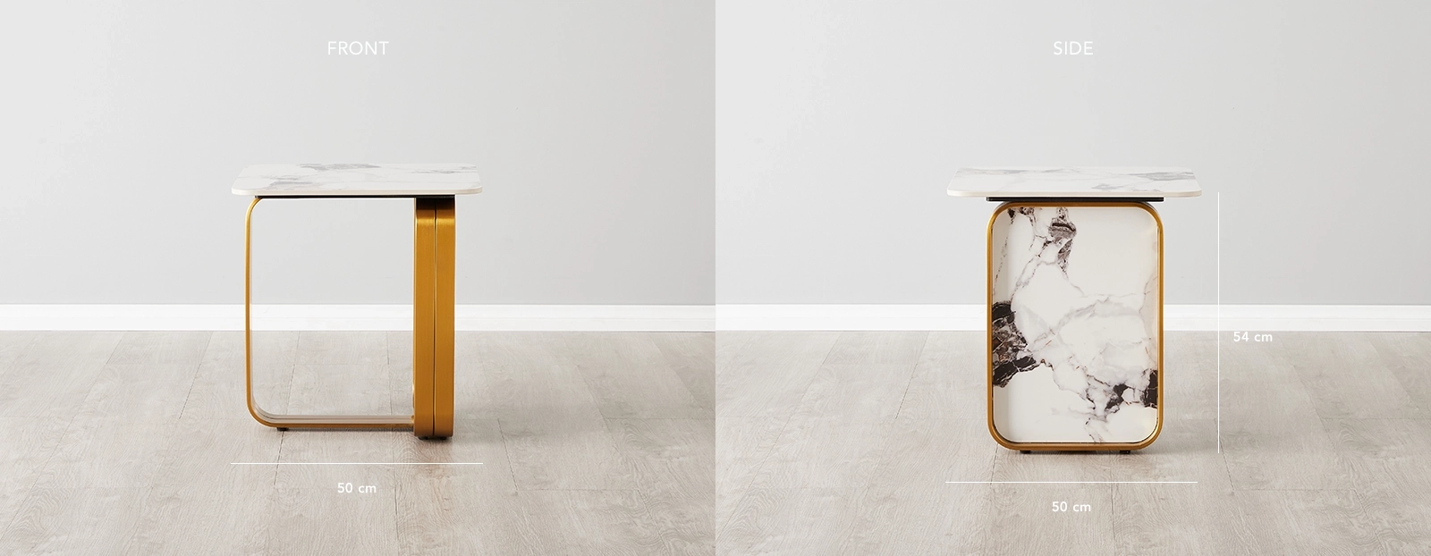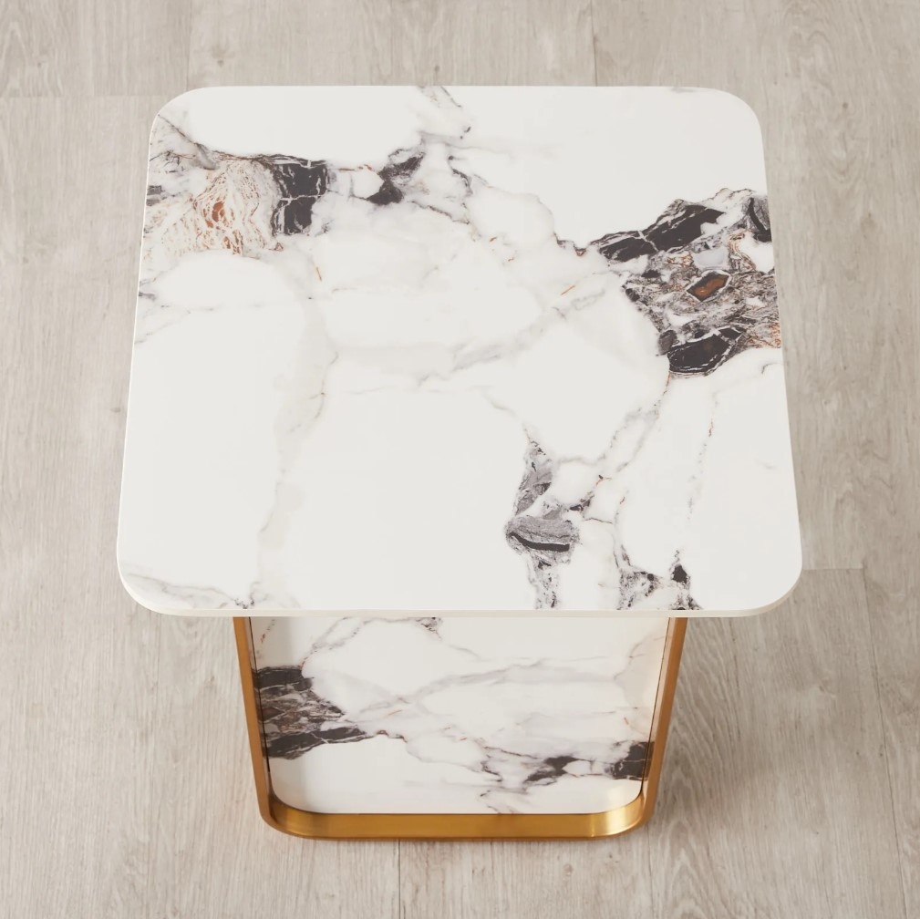 Designed not only as an elegant accompaniment to your main furnishings but also as a pinnacle of luxury, the Marbella Cold Calacatta White Sintered Stone Side Table elevates any living space. The highlight of this table is undeniably its expansive top, meticulously crafted from the Cold Calacatta White Sintered Stone. The intricate veins and polished finish of this surface transform what could be a simple side table into a statement of opulence. Whether you're resting a glass, showcasing a decorative lamp, or arranging a bouquet of flowers, this side table provides the perfect platform, harmoniously melding function with high-end aesthetics.
