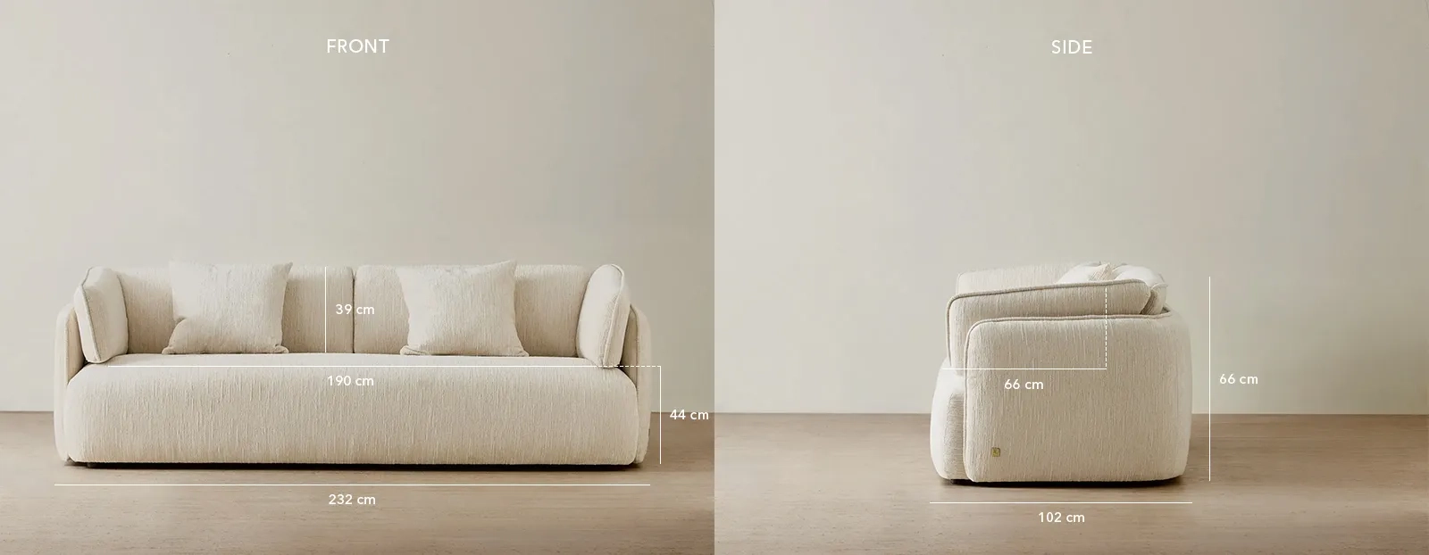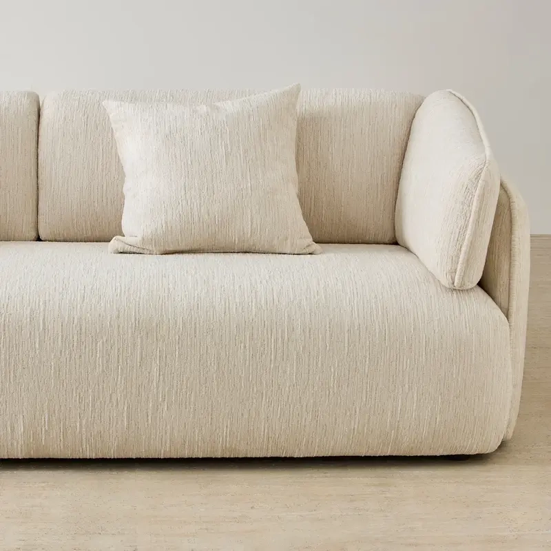 Wrapped in soft Atlas Cream chenille, the textured fabric adds warmth and richness to the sofa’s sculptural curves. The Marcela combines visual softness with spacious, everyday comfort.