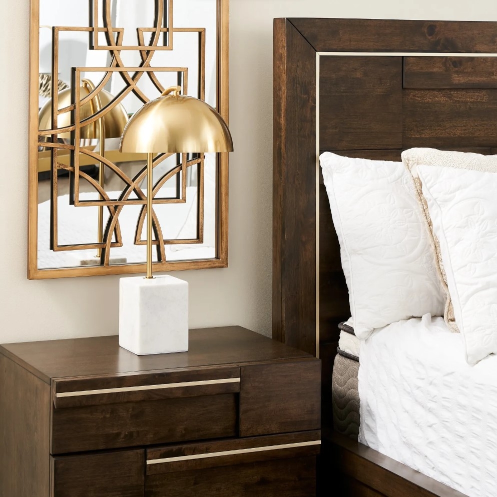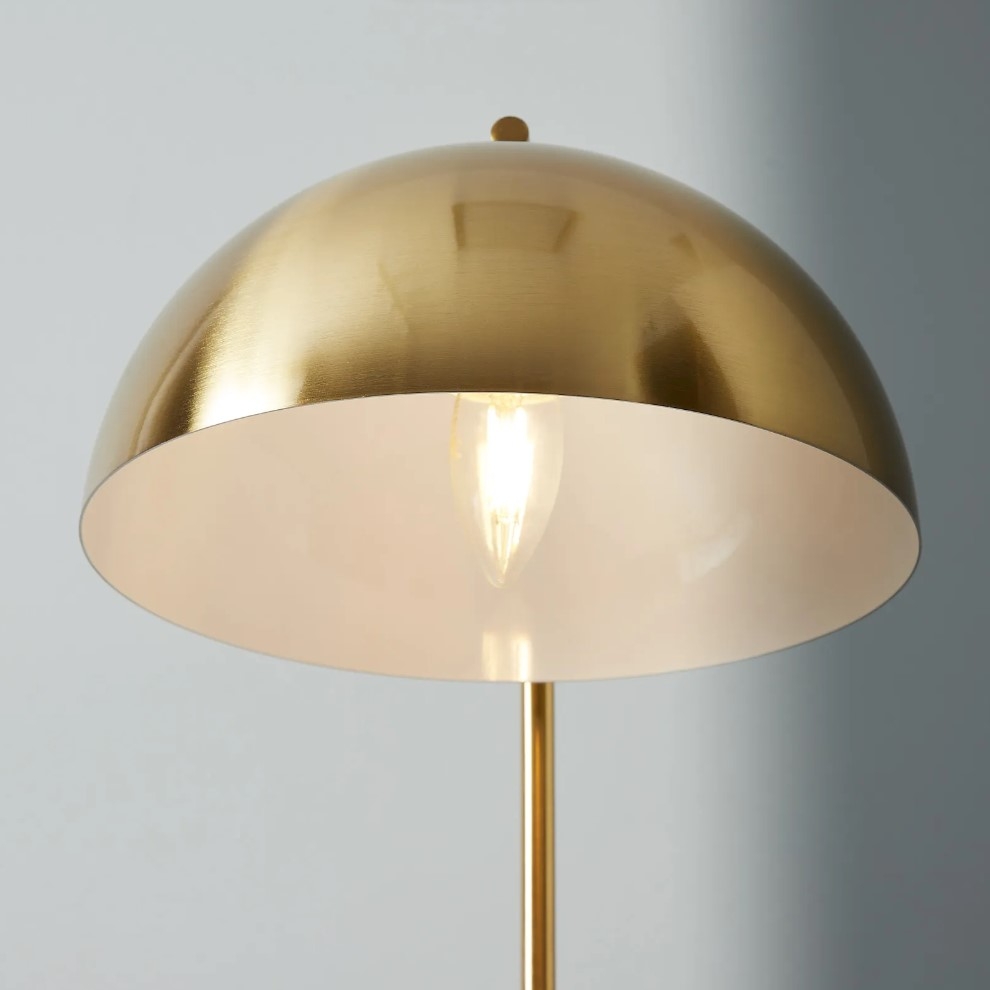 Below, the lamp finds its grounding in a solid square block of white marble, lending the design not just stability but a timeless sophistication. The dichotomy is striking—the ethereal shine of golden metal harmonizing effortlessly with the earth-bound permanence of marble.