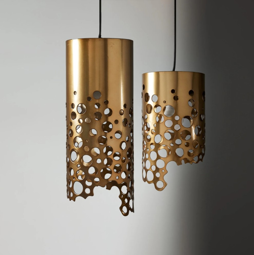 The Marianna Coral Pendant Light features a sculpted metal shade with intricate holes and flowing curves inspired by coral formations.