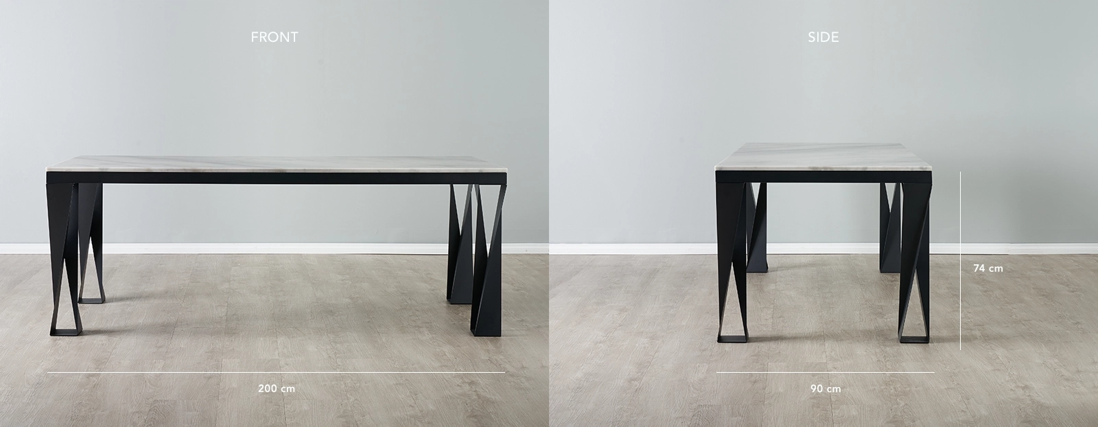 Providing stability two pairs of stainless steel table legs come in sophisticated black colours to offer a wealth of intrigue with their dynamic spiral design. The combination of Luxurious marble with dark-coloured stainless steel will enhance your home dining experience. This 200cm variant is perfect for grander celebrations. Pair with an ensemble of our gorgeous dining chairs for a truly stunning spread.