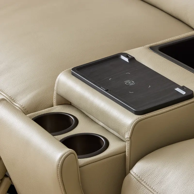 Dual electric recliners sit quietly within both seats, letting the headrest and footrest glide into place with smooth ease. Between them, the central console includes a concealed charging pad and integrated cup holders.