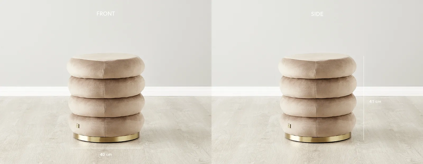 The Megan Beige Velvet Ottoman exudes contemporary charm with its layered, rounded form, offering a modern twist on classic luxury. Each tier of plush velvet invites a touch, layered like a sumptuous cake, and the beige hue adds a subtle, on-trend, yet timeless appeal that can complement a variety of palettes. This ottoman's style is crowned by a lustrous, brass-colored band that encircles its base, providing a chic metallic contrast that truly makes the piece pop.