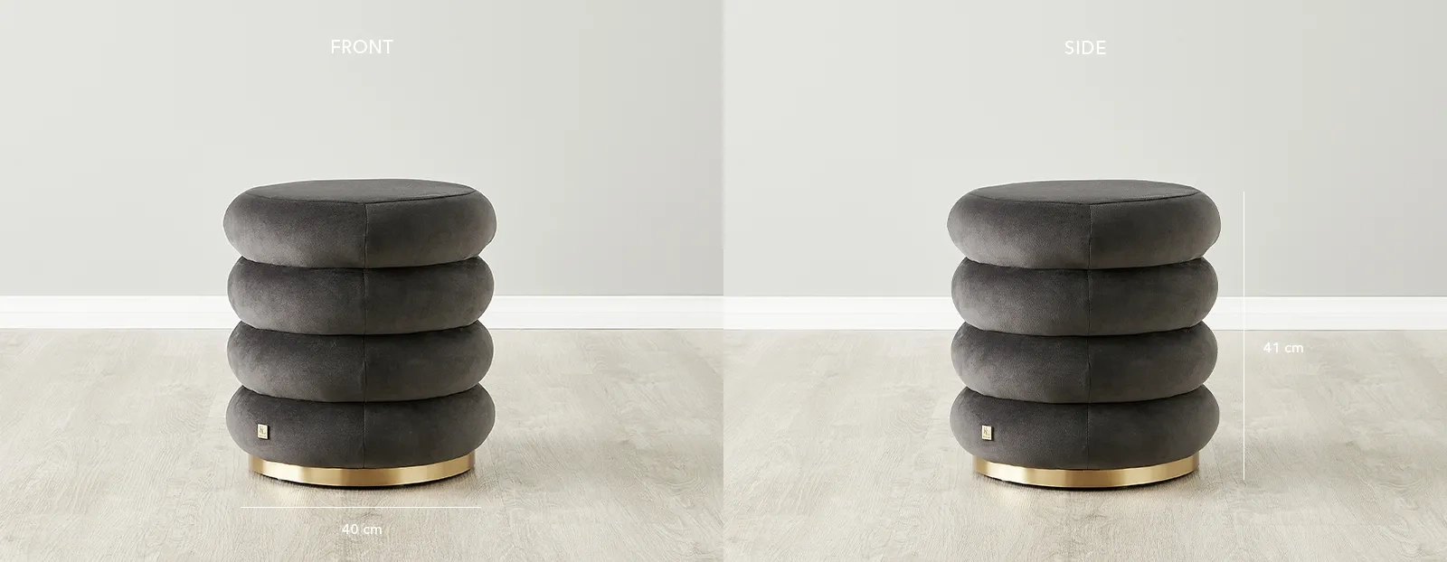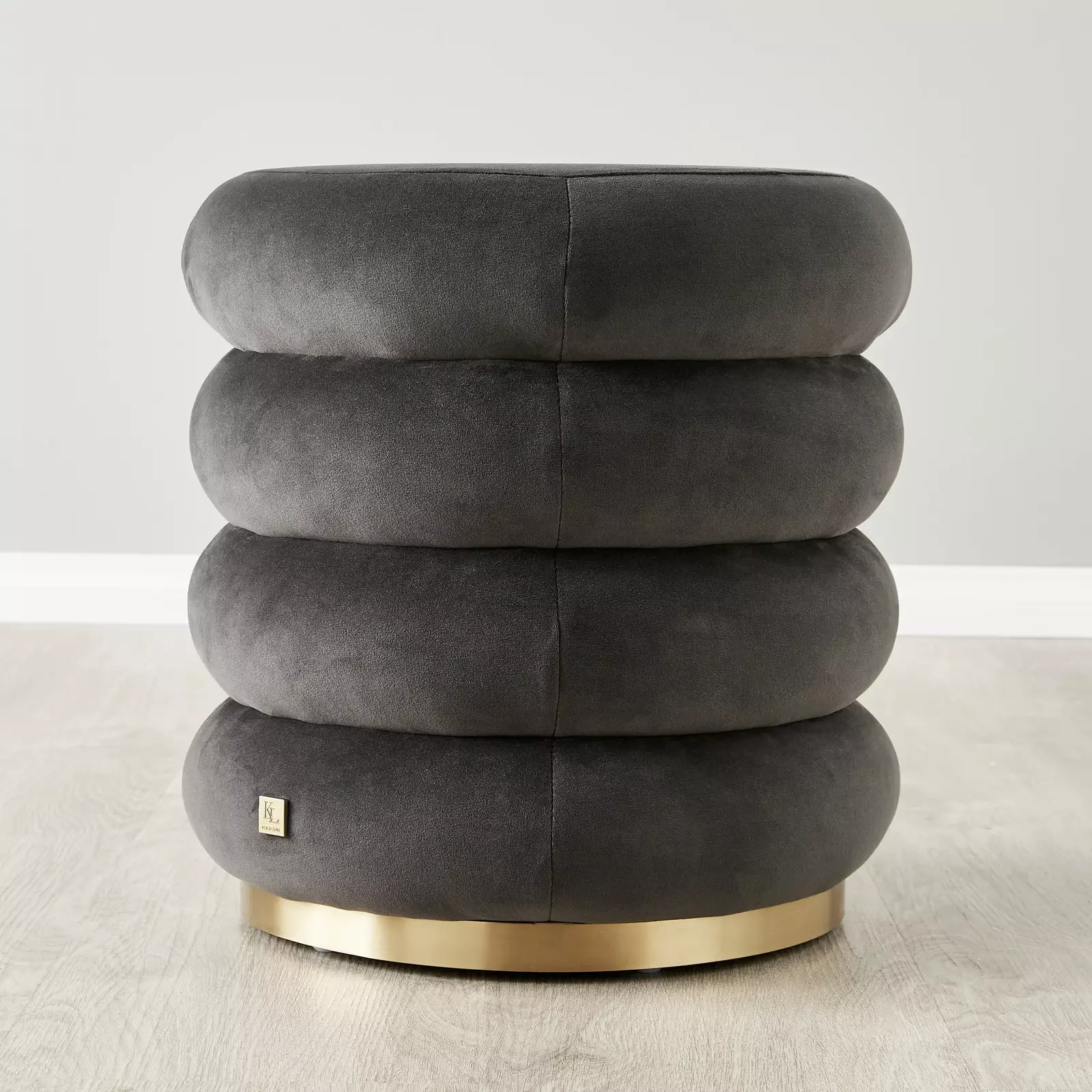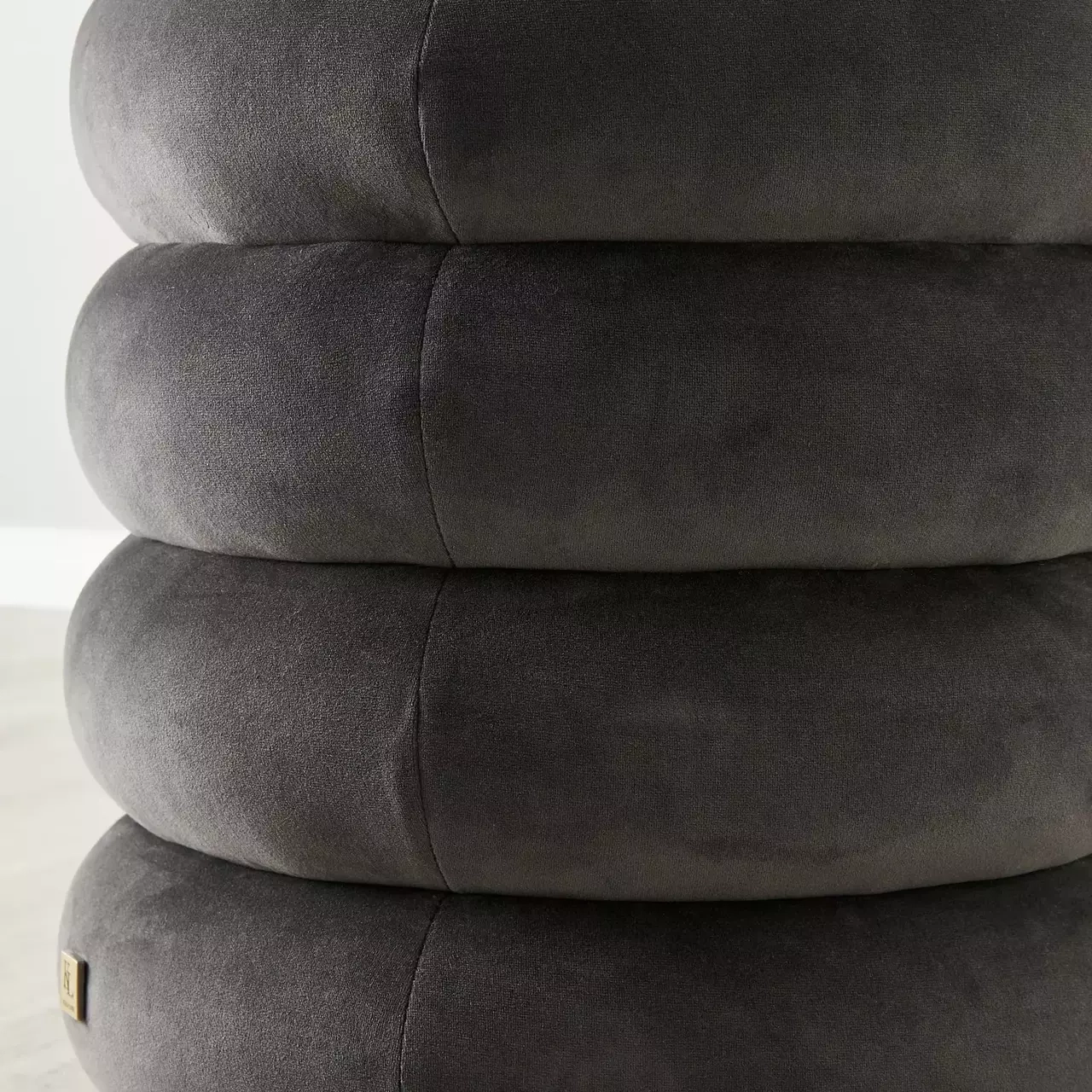 The Megan Charcoal Velvet Ottoman exudes a contemporary charm with its layered, rounded form that offers a modern twist on classic luxury. Each tier of plush velvet invites a touch, layered like a sumptuous cake, and the charcoal coloured hue adds an on-trend, yet timeless, appeal that can complement a variety of palettes. This ottoman's style is crowned by a lustrous, brass-colored band that encircles its base, providing a chic metallic contrast that truly makes the piece pop.