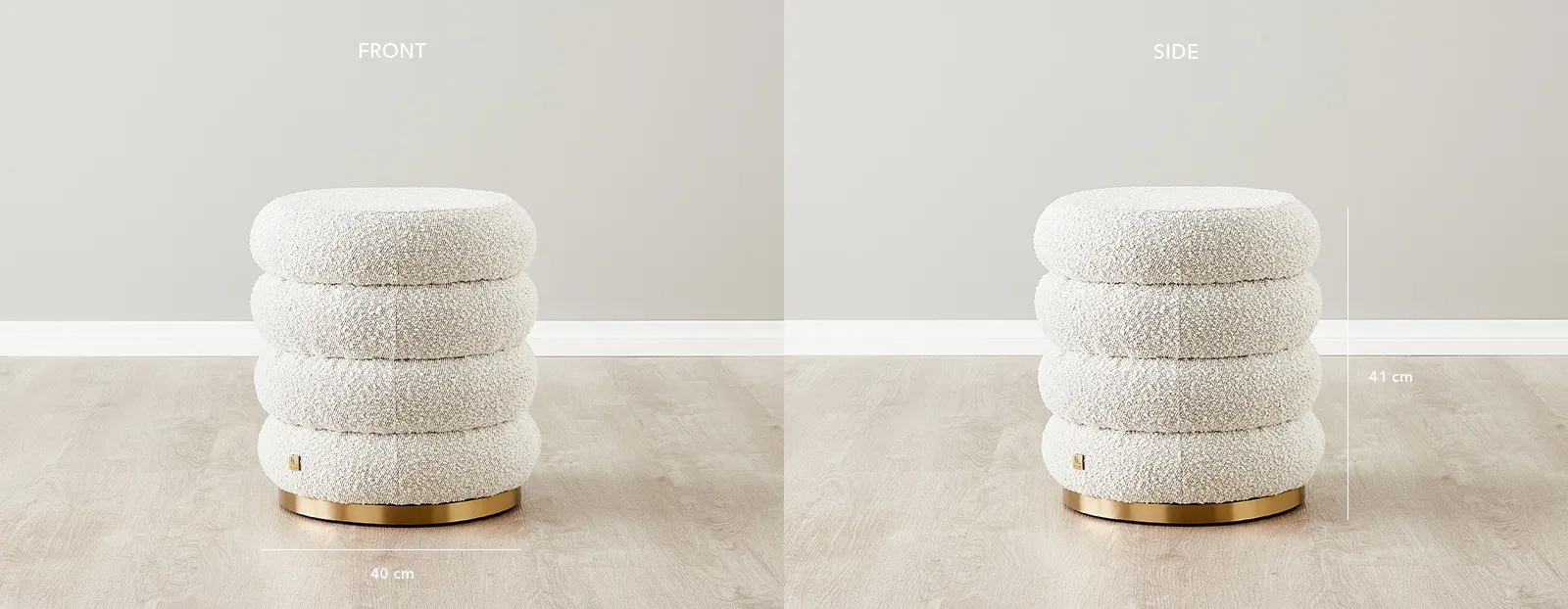 The Megan Cream Bouclé Fabric Ottoman exudes contemporary charm with its layered, rounded form, offering a modern twist on classic luxury. Each tier of plush bouclé fabric invites a touch, layered like a sumptuous cake, and the cream-colored hue adds an on-trend, yet timeless appeal that can complement a variety of palettes. This ottoman's style is crowned by a lustrous, brass-colored band that encircles its base, providing a chic metallic contrast that truly makes the piece pop.