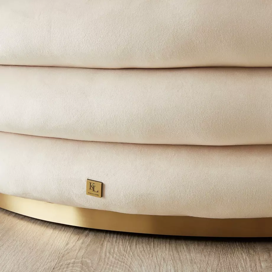 The Megan Ottoman is wrapped in beautiful cream-colored velvet fabric with a plush surface, adding both comfort and aesthetic appeal to the piece.