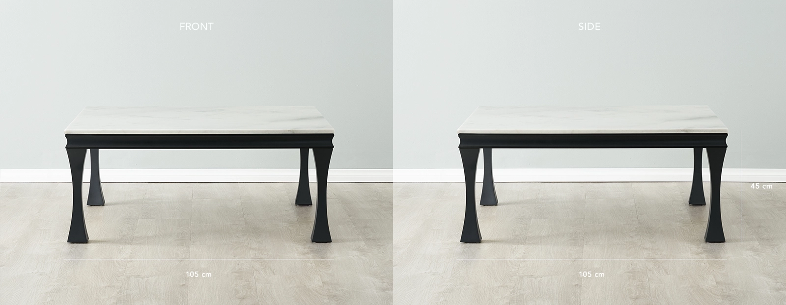 The Melody is supported by stainless steel legs in a concave design, adding stability and a touch of sophistication. The combination of white marble and a dark frame creates a striking monochromatic look, perfect alongside a stylish sofa and side tables.