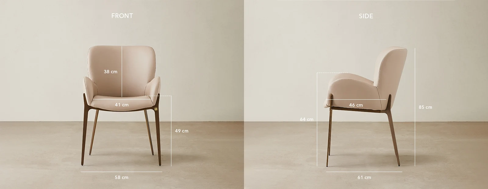 Experience prolonged comfort with its cushioned seat and curved backrest, designed for long meals. The armrests enhance comfort, making Milana a stylish accent piece as well.