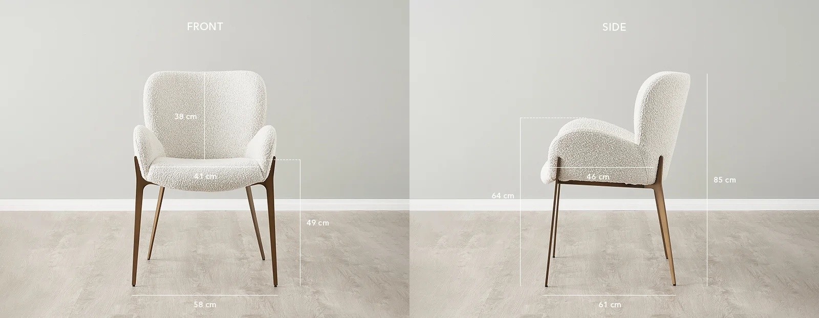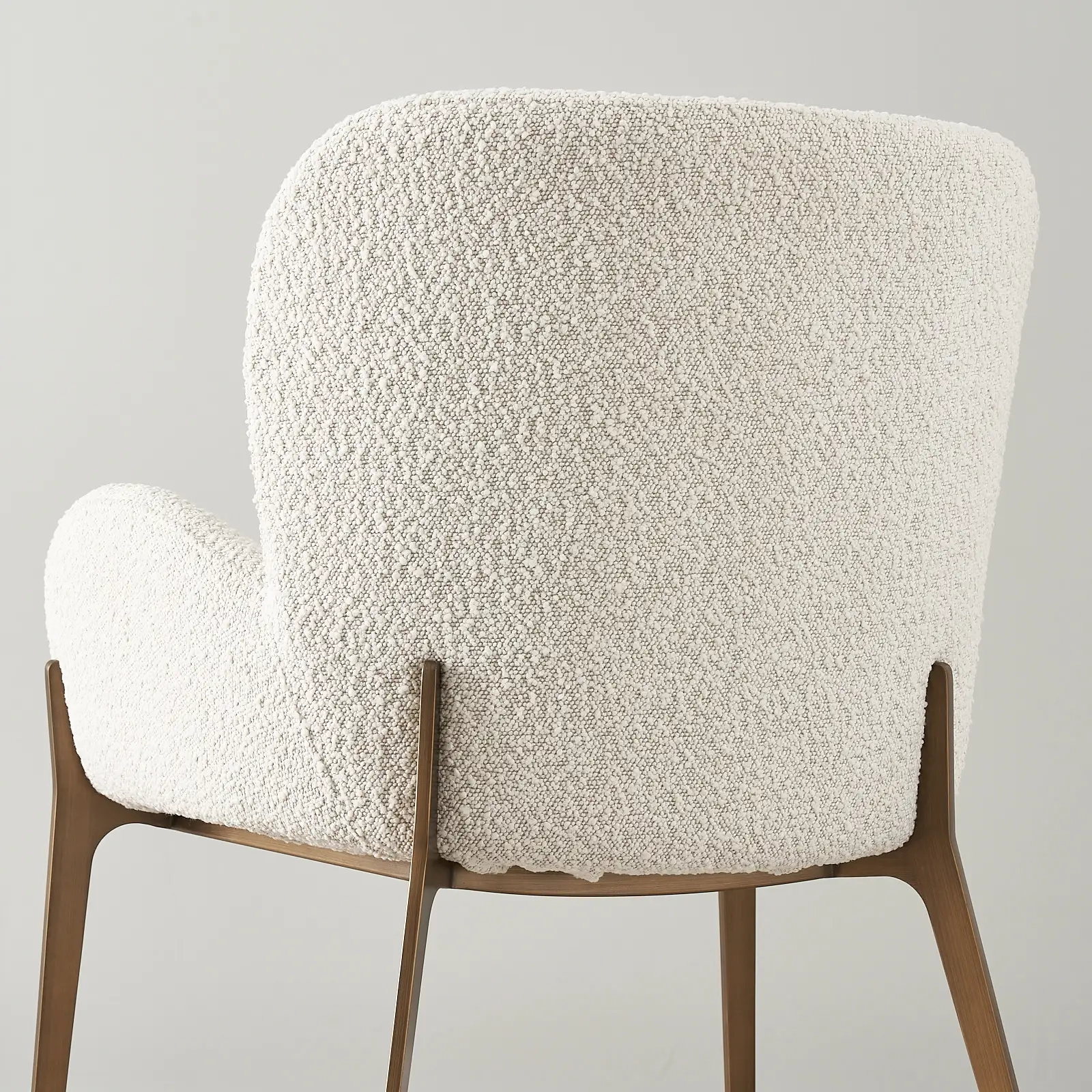 Enjoy modern dining with the Milana Snow White Boucle Dining Chair. Upholstered in snow white boucle and supported by sleek bronze legs, it exudes subtle elegance.