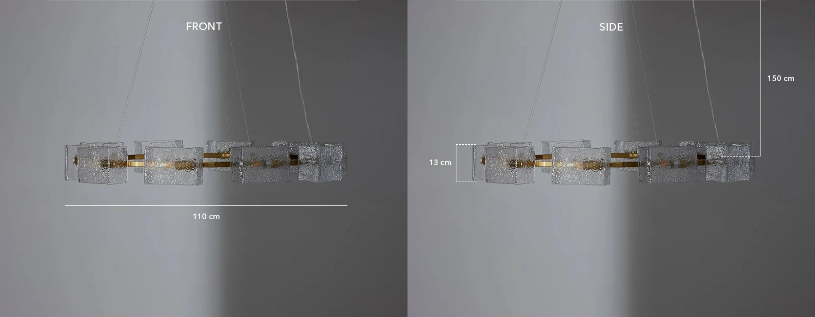 Hanging gracefully, it casts a soft, ambient glow that elevates any space. Its brushed gold frame complements the chandelier's refined and modern look.