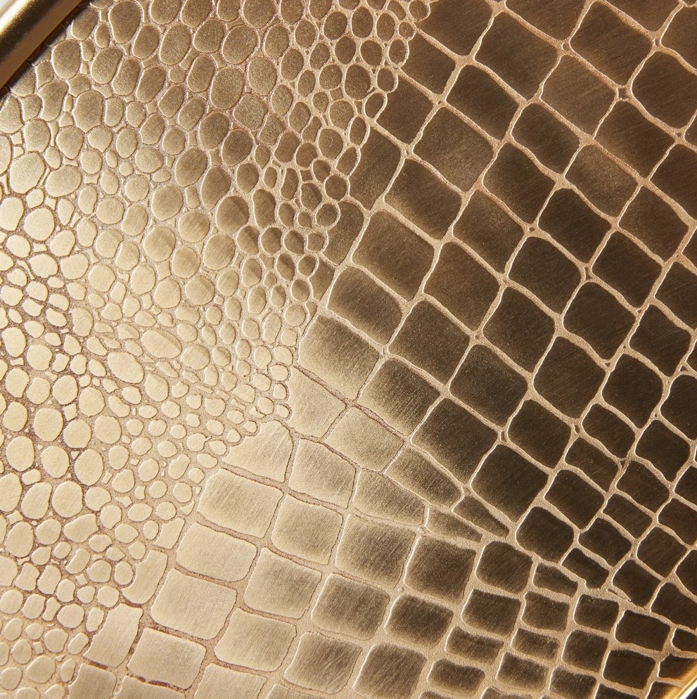The all-black watch face is accentuated by gleaming golden details, creating a striking visual contrast. But the true highlight is the clock's outer border; the intricate croc pattern, set against the shimmering antique brass backdrop, adds an additional layer of sophistication. The Miriam doesn't just tell time - it narrates a tale of refined elegance.