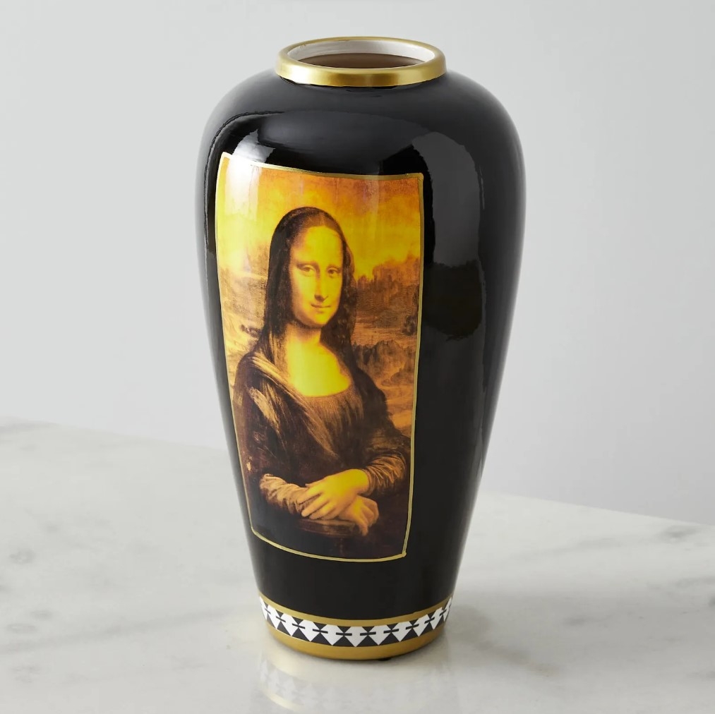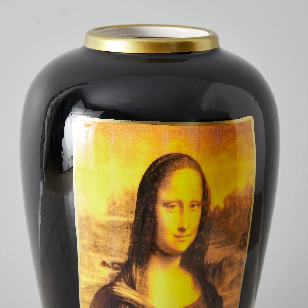 On the jar's deep black body, the iconic image of the Mona Lisa is rendered in a luminescent yellow hue. This choice of color not only evokes a sense of nostalgia but also highlights the intricacies of the painting, giving it a refreshed and modern appeal.